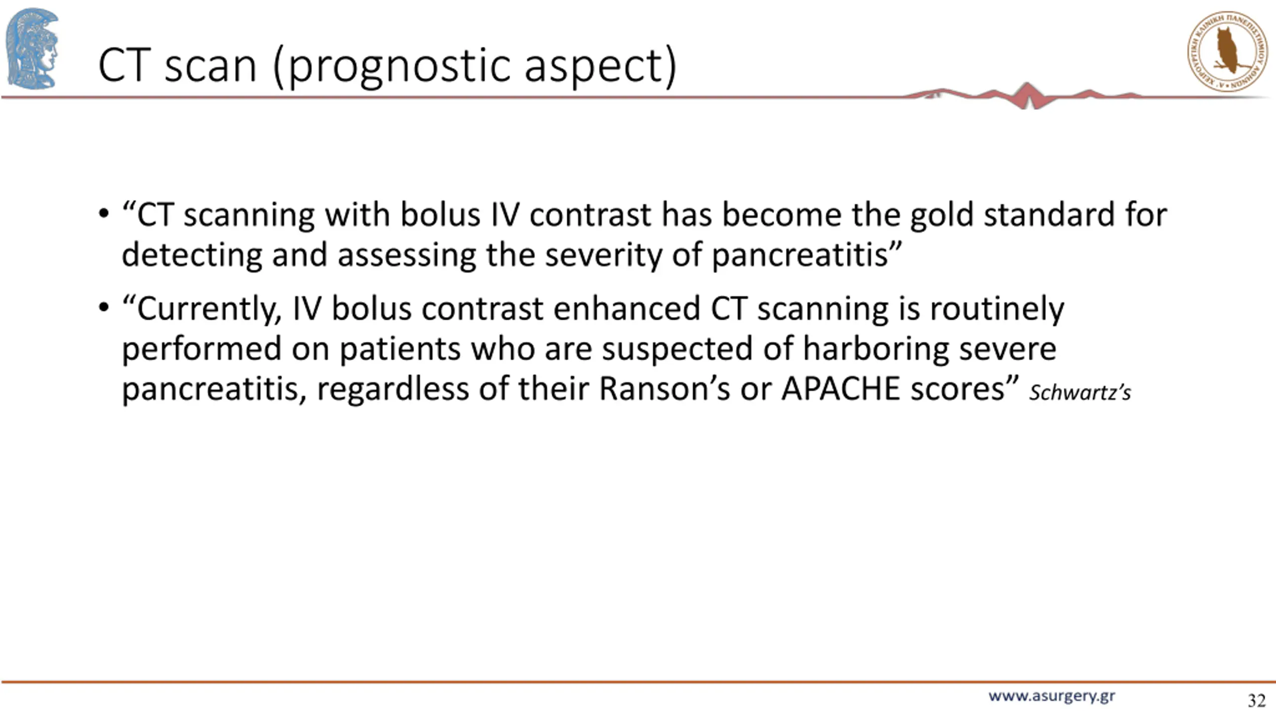 CT scan (prognostic aspect) CT scanning with bolus IV contrast has become the gold standard for detecting and assessing the severity of pancreatitis Currently, IV bolus contrast enhanced CT scanning is routinely performed on patients who are suspected of harboring severe pancreatitis, regardless of their Ranson s or APACHE scores Schwartz s 32