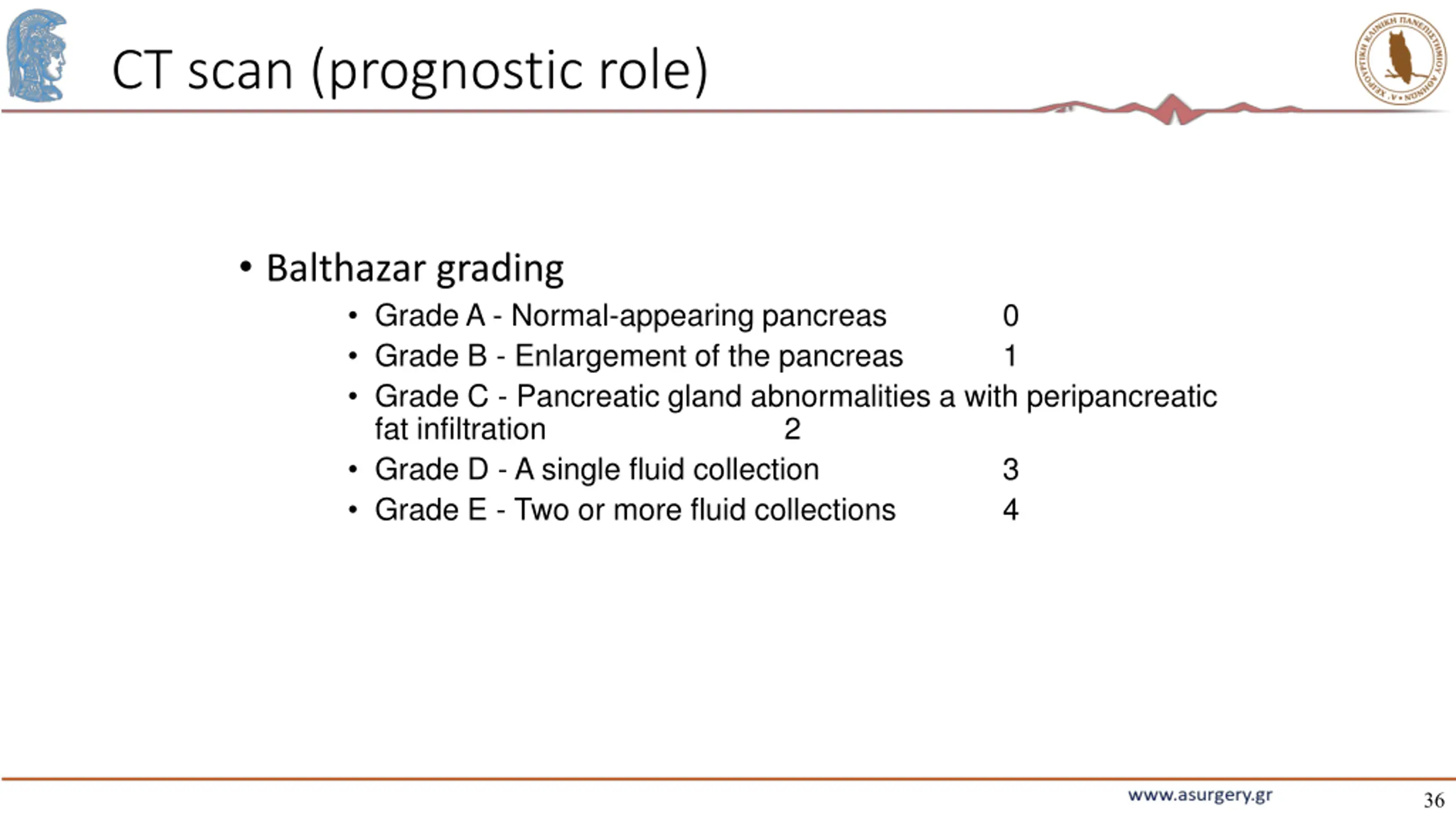 CT scan (prognostic role) Balthazar grading Grade A - Normal-appearing pancreas Grade B - Enlargement of the pancreas Grade C - Pancreatic gland abnormalities a with peripancreatic fat infiltration Grade D - A single fluid collection Grade E - Two or more fluid collections 0 1 2 3 4 36
