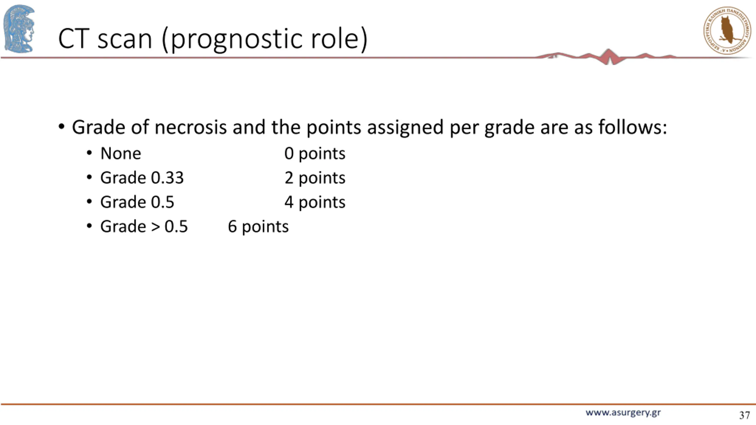 CT scan (prognostic role) Grade of necrosis and the points assigned per grade are as follows: None 0 points Grade 0.33 2 points Grade 0.5 4 points Grade > 0.5 6 points 37