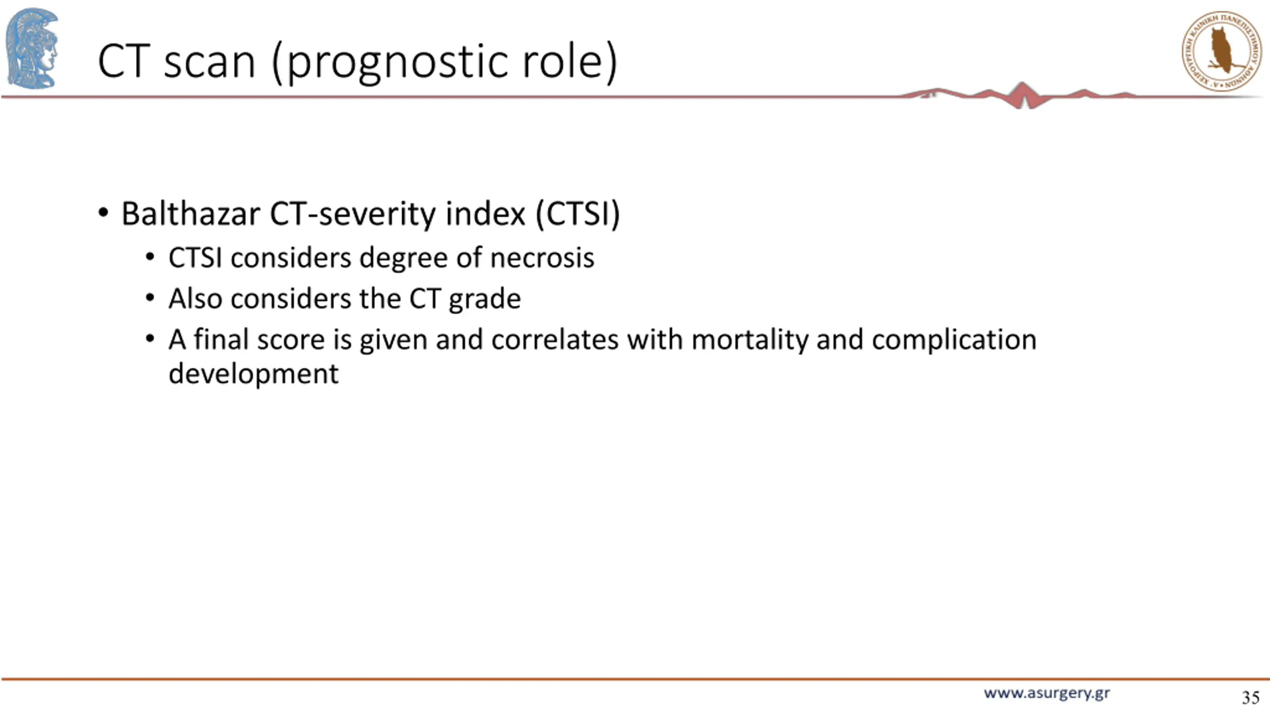 CT scan (prognostic role) Balthazar CT-severity index (CTSI) CTSI considers degree of necrosis Also considers the CT grade A final score is given and correlates with mortality and complication development 35