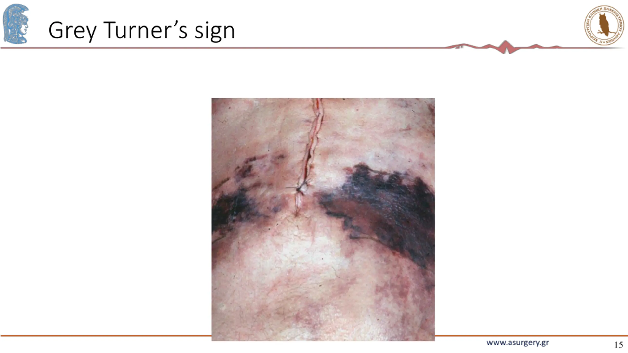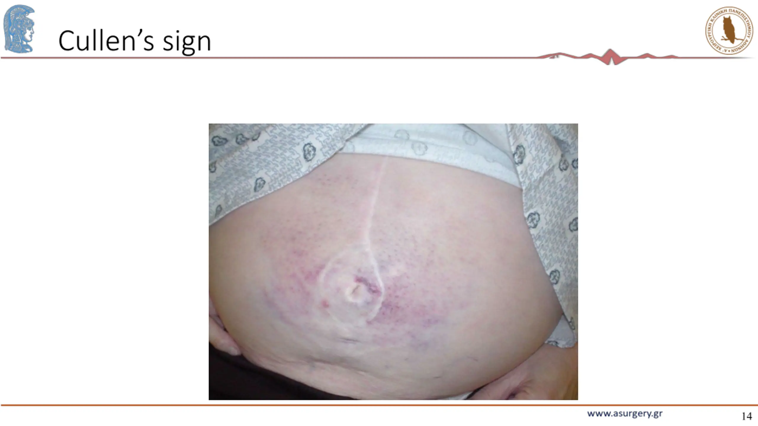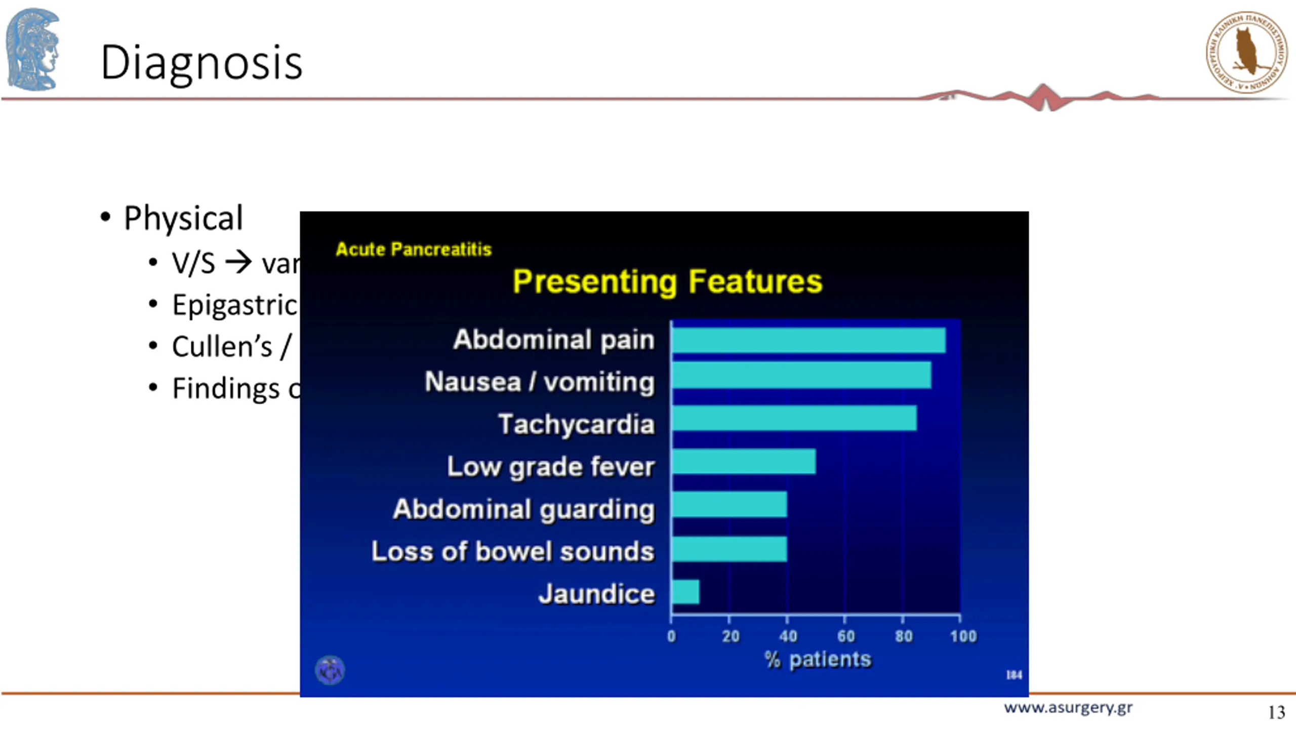 Diagnosis Physical V/S variable Epigastric tenderness Cullen s / Grey Turner s (1%) Findings of complication(s) 13