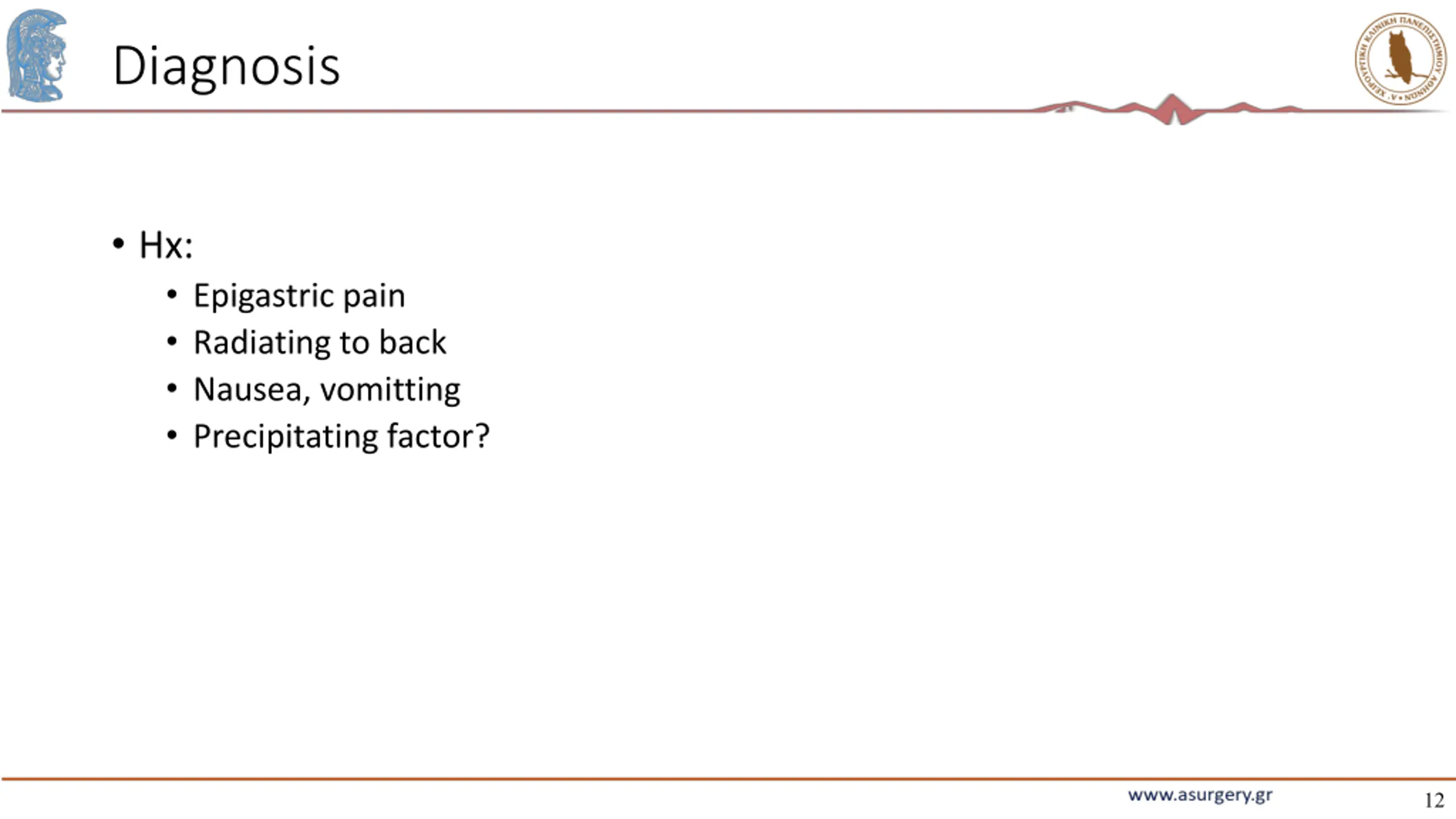 Diagnosis Hx: Epigastric pain Radiating to back Nausea, vomitting Precipitating factor? 12