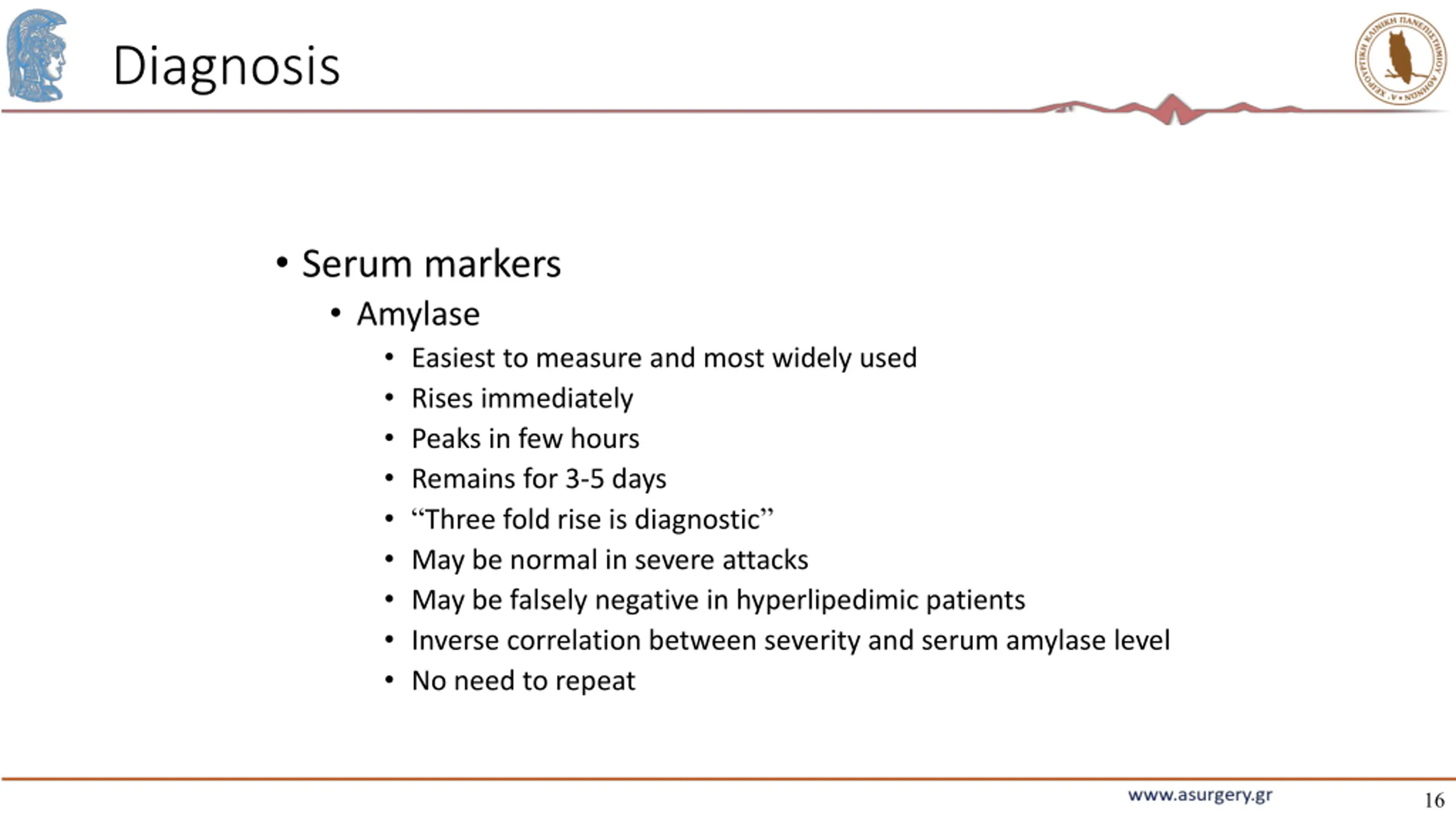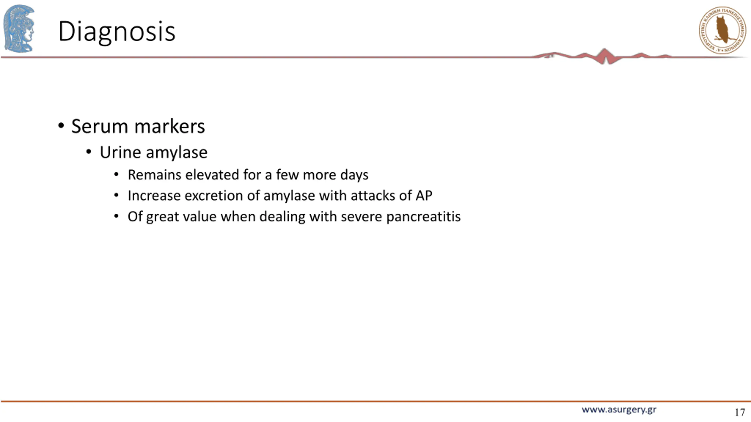 Diagnosis Serum markers Urine amylase Remains elevated for a few more days Increase excretion of amylase with attacks of AP Of great value when dealing with severe pancreatitis 17