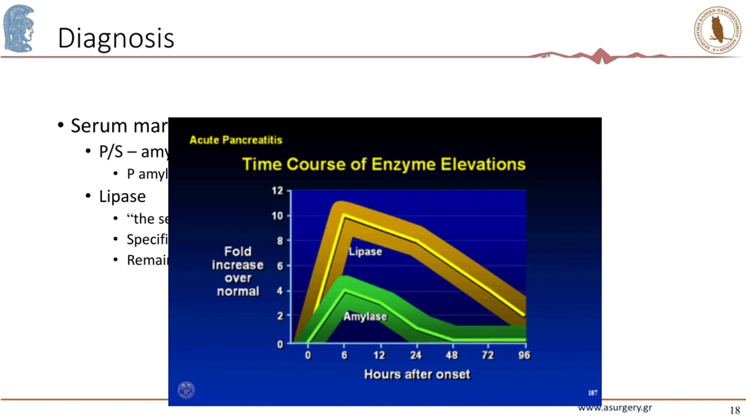 Diagnosis Serum markers P/S amylase P amylase increases specificity to 93% Lipase the serum marker of highest probability of disease Specificity of 96% Remains elevated for longer time than total amylase 18