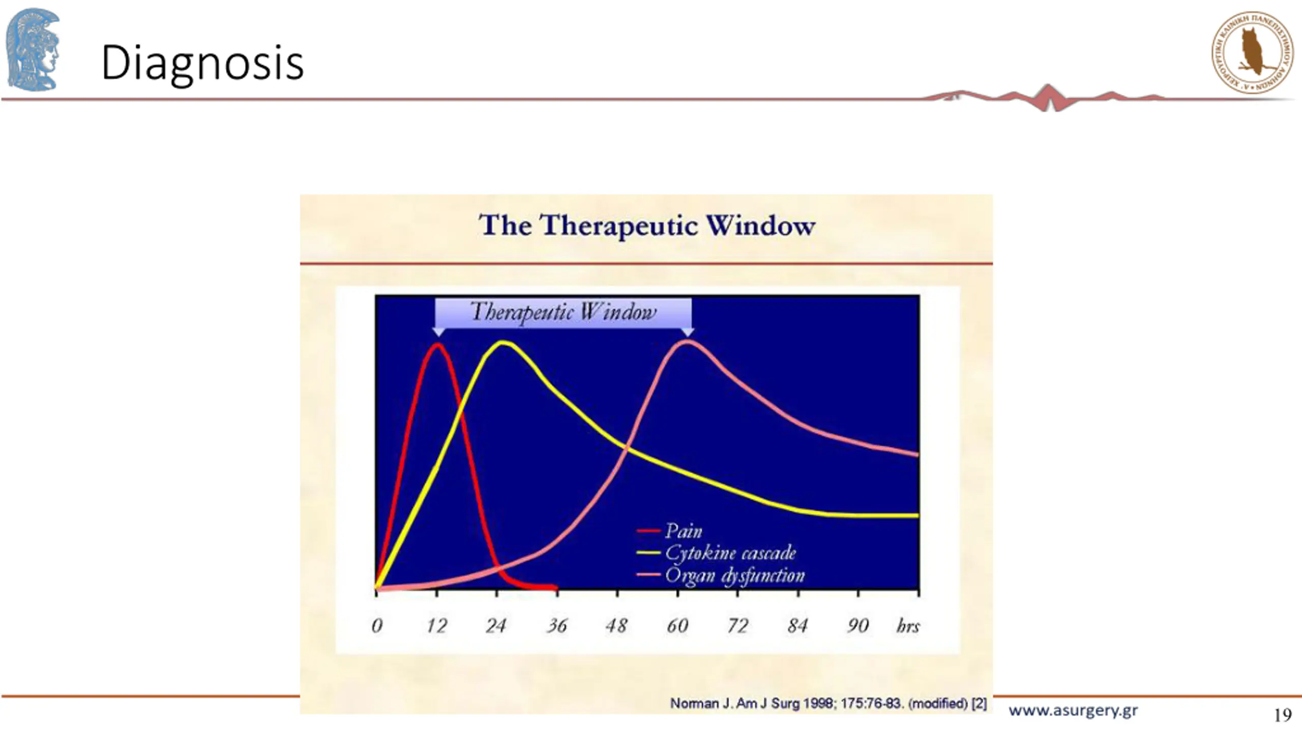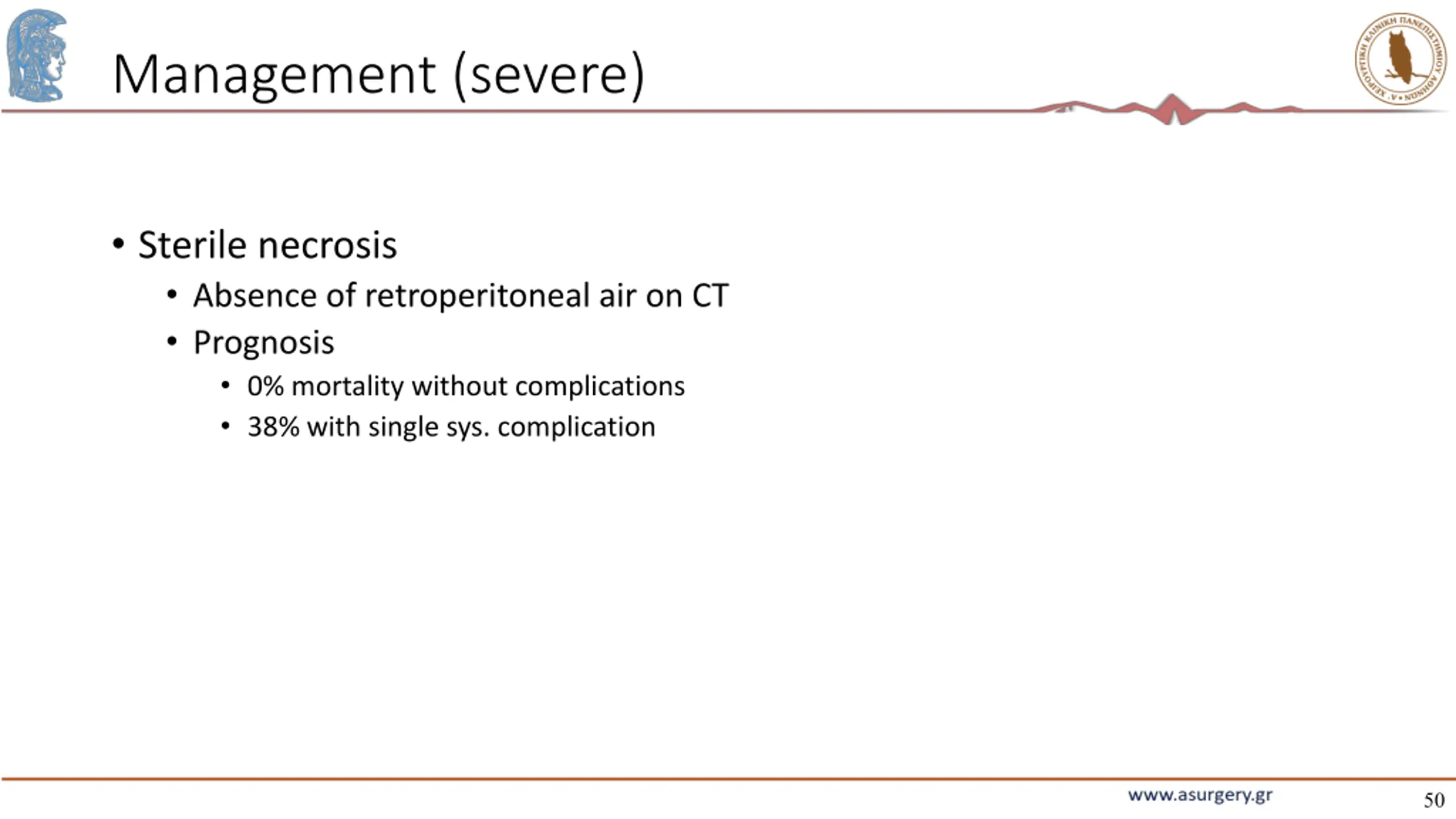 Management (severe) Sterile necrosis Absence of retroperitoneal air on CT Prognosis 0% mortality without complications 38% with single sys. complication 50