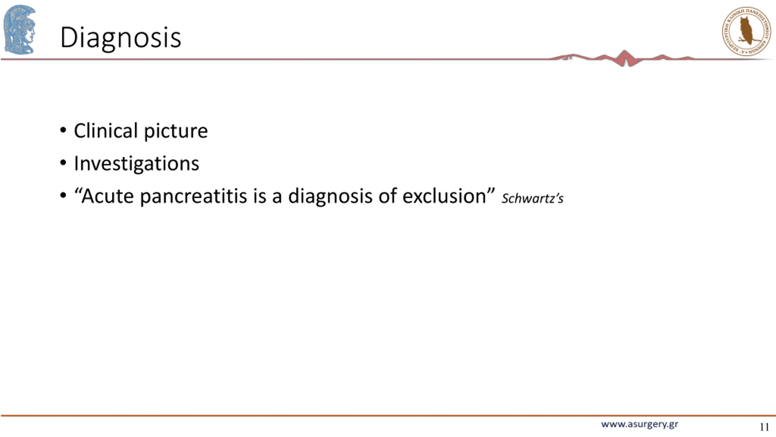 Diagnosis Clinical picture Investigations Acute pancreatitis is a diagnosis of exclusion Schwartz s 11