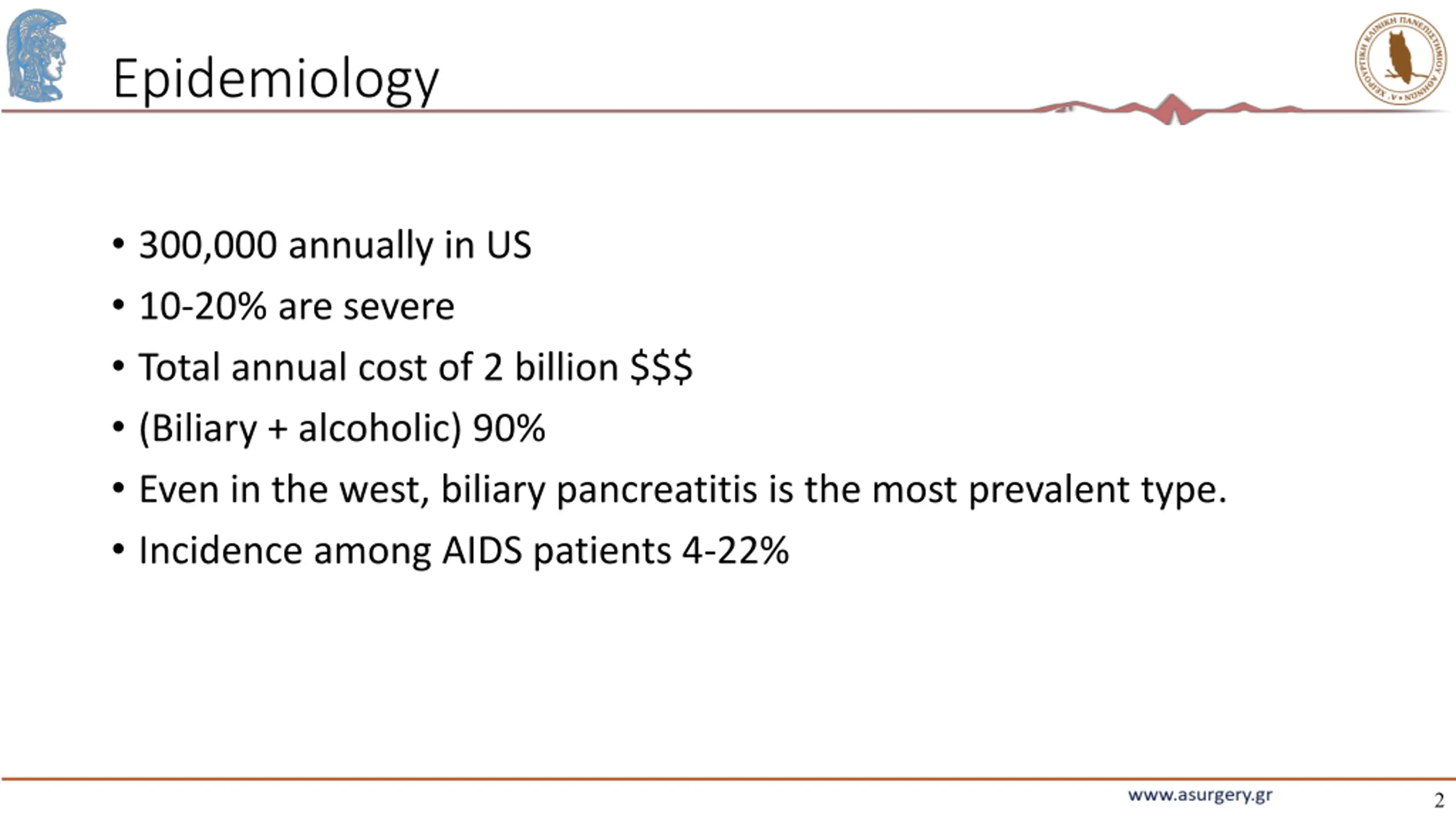 Epidemiology 300,000 annually in US 10-20% are severe Total annual cost of 2 billion $$$ (Biliary + alcoholic) 90% Even in the west, biliary pancreatitis is the most prevalent type. Incidence among AIDS patients 4-22% 2