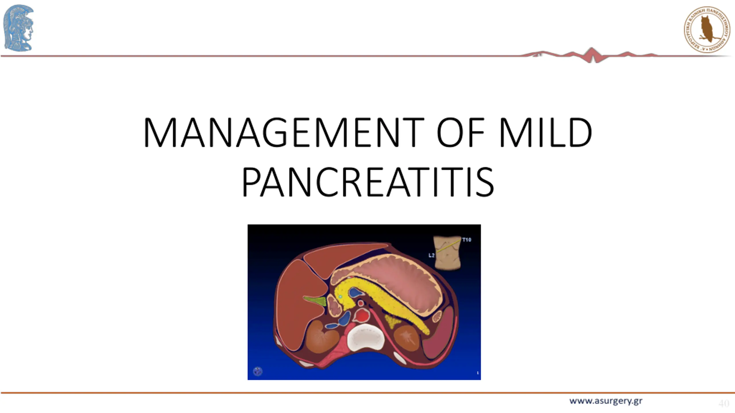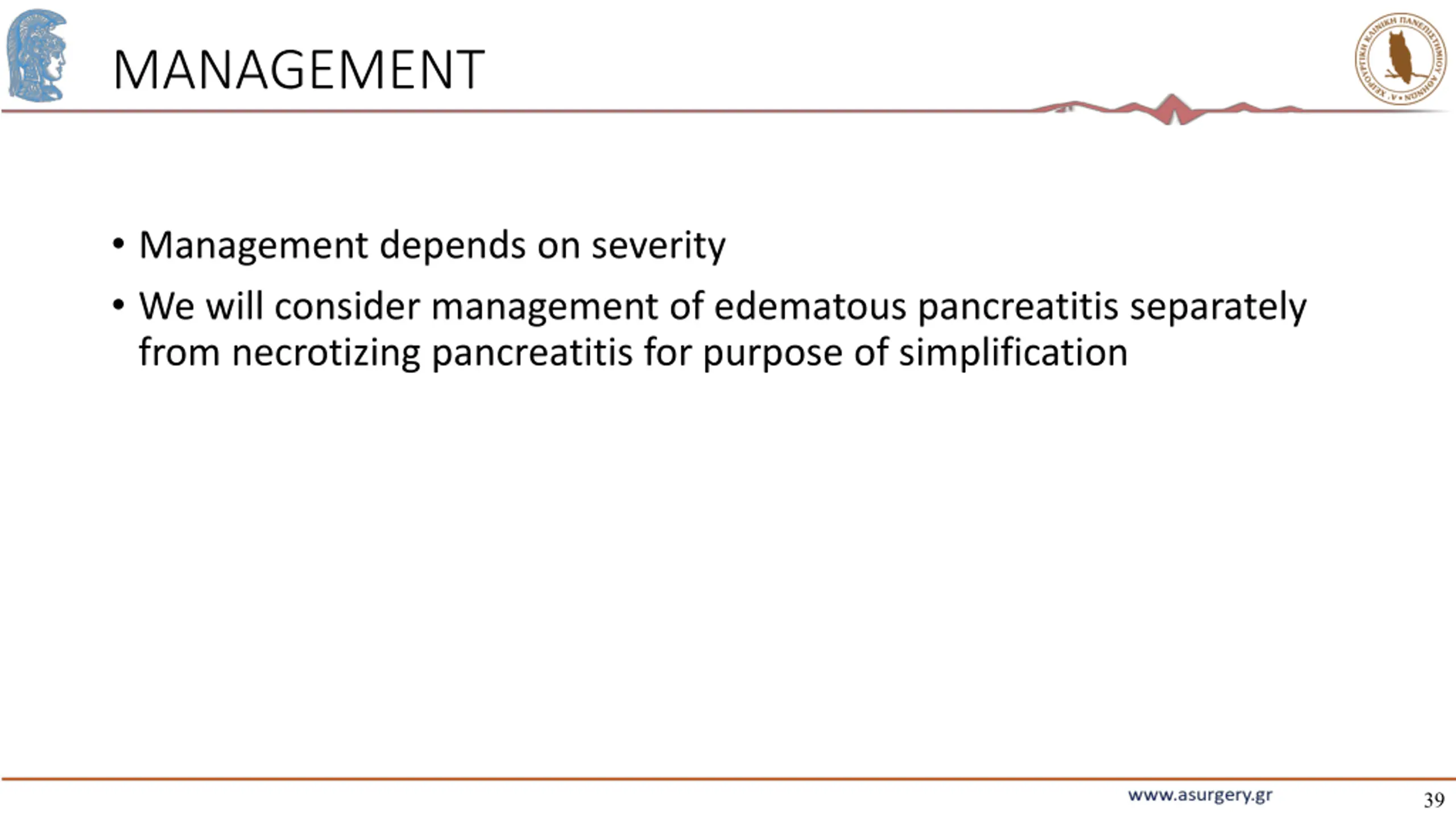 MANAGEMENT Management depends on severity We will consider management of edematous pancreatitis separately from necrotizing pancreatitis for purpose of simplification 39