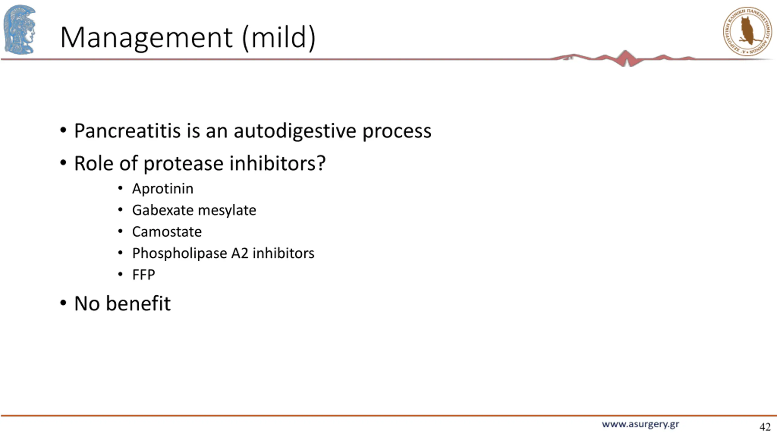 Management (mild) Pancreatitis is an autodigestive process Role of protease inhibitors? Aprotinin Gabexate mesylate Camostate Phospholipase A2 inhibitors FFP No benefit 42