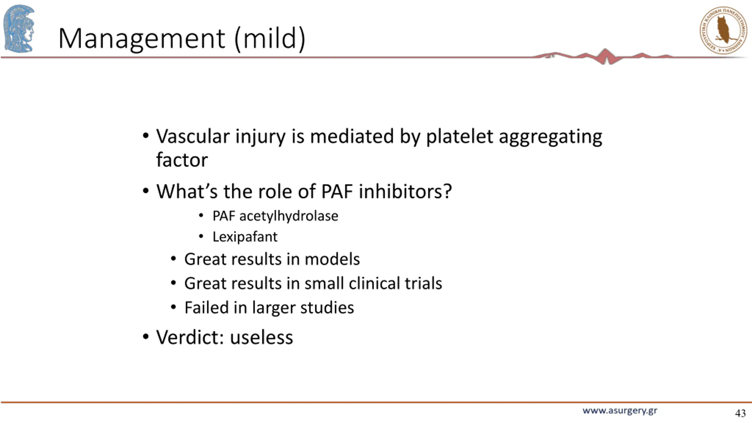 Management (mild) Vascular injury is mediated by platelet aggregating factor What s the role of PAF inhibitors? PAF acetylhydrolase Lexipafant Great results in models Great results in small clinical trials Failed in larger studies Verdict: useless 43
