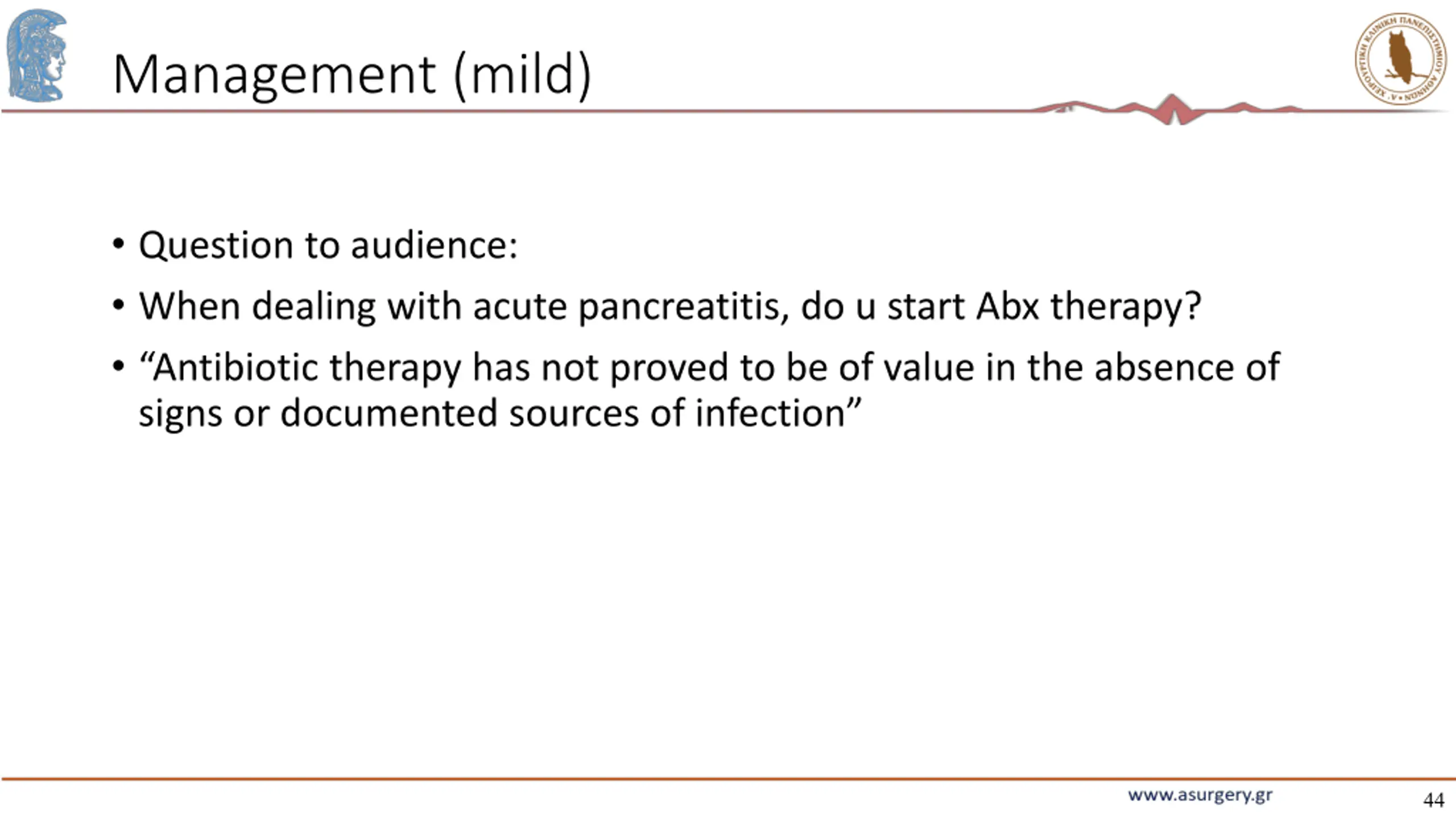 Management (mild) Question to audience: When dealing with acute pancreatitis, do u start Abx therapy? Antibiotic therapy has not proved to be of value in the absence of signs or documented sources of infection 44