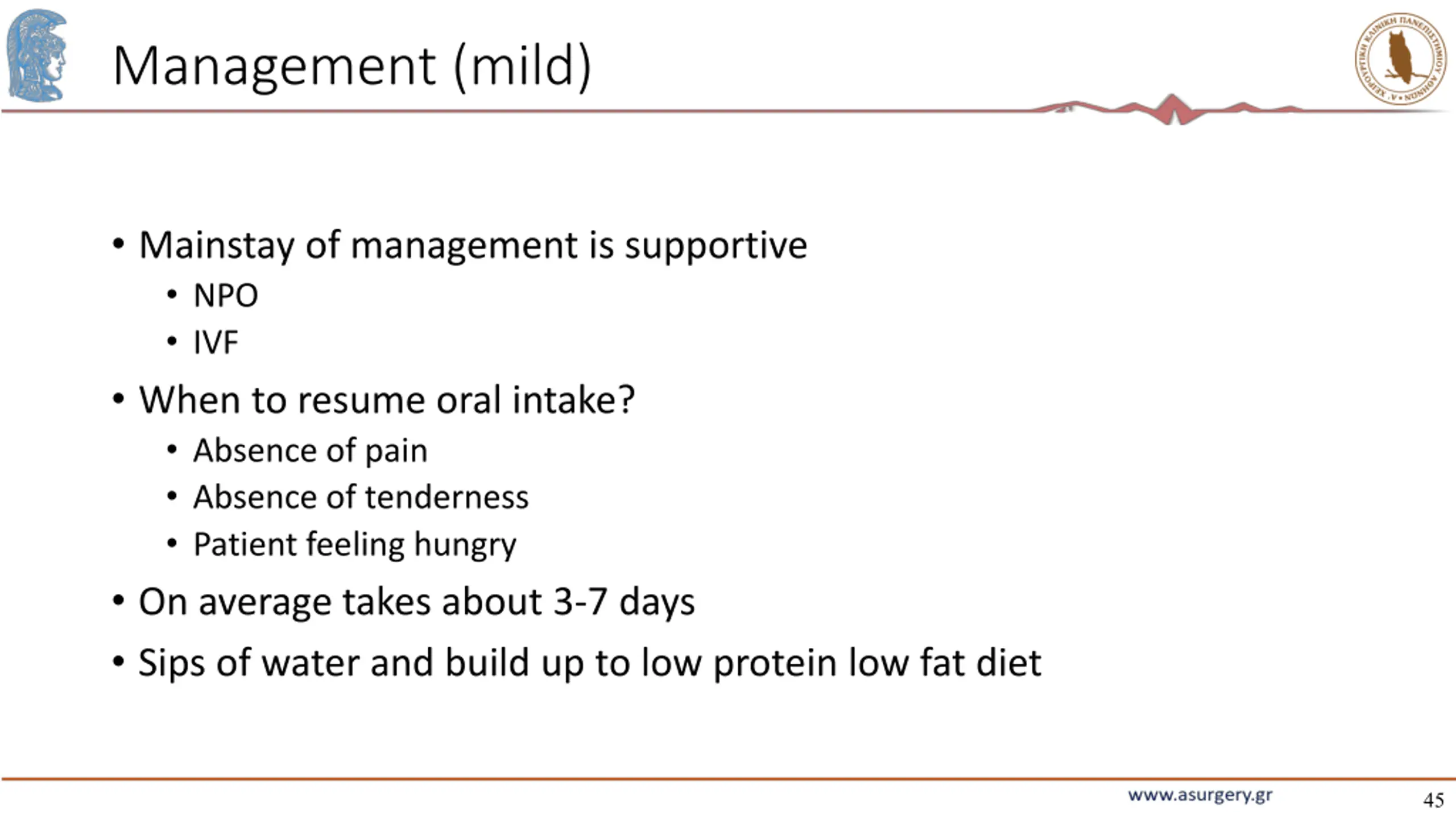 Management (mild) Mainstay of management is supportive NPO IVF When to resume oral intake? Absence of pain Absence of tenderness Patient feeling hungry On average takes about 3-7 days Sips of water and build up to low protein low fat diet 45