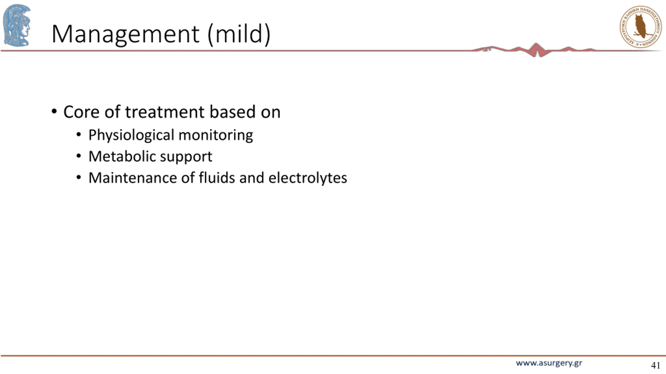 Management (mild) Core of treatment based on Physiological monitoring Metabolic support Maintenance of fluids and electrolytes 41