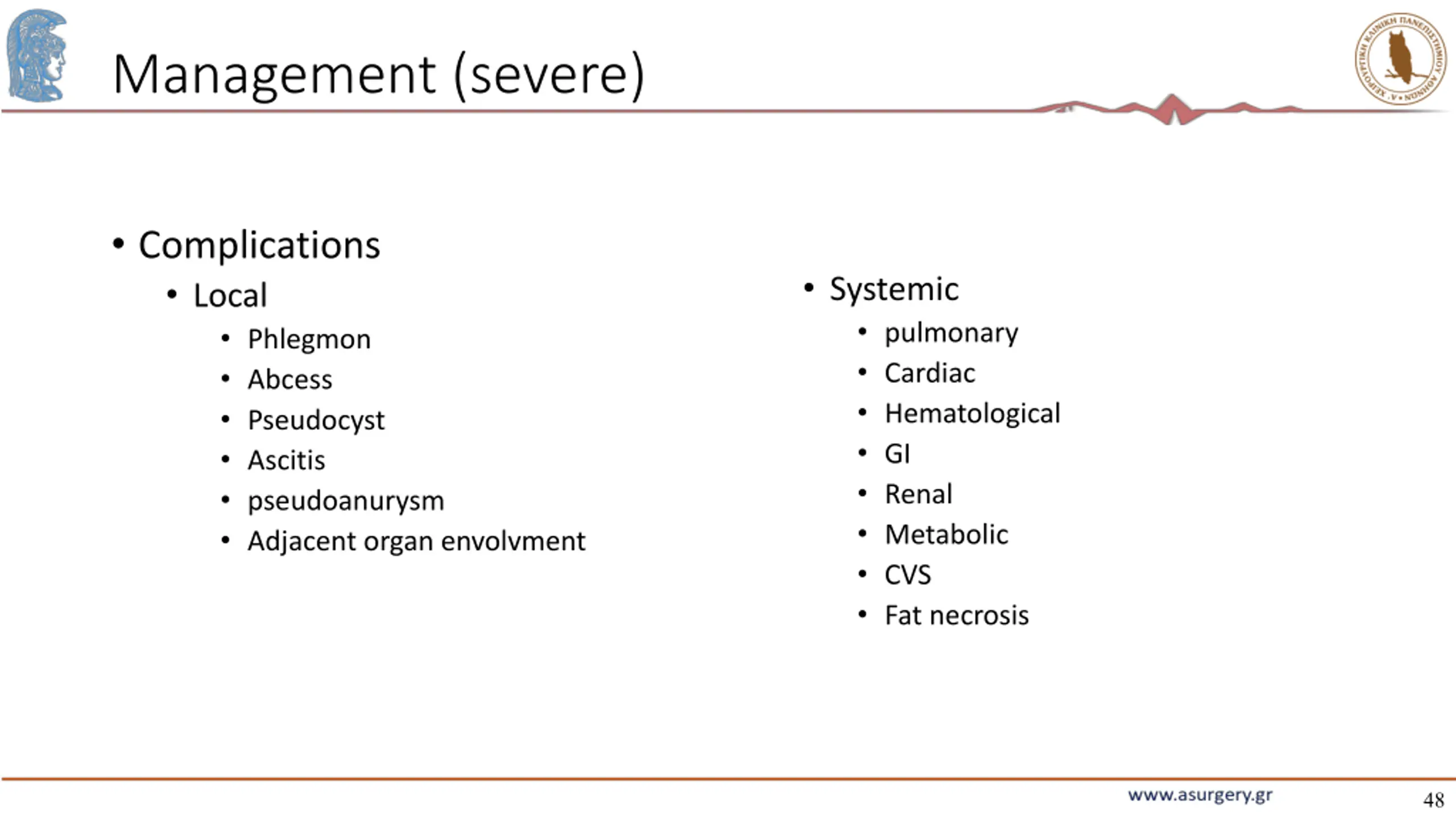 Management (severe) Complications Local Phlegmon Abcess Pseudocyst Ascitis pseudoanurysm Adjacent organ envolvment Systemic pulmonary Cardiac Hematological GI Renal Metabolic CVS Fat necrosis 48