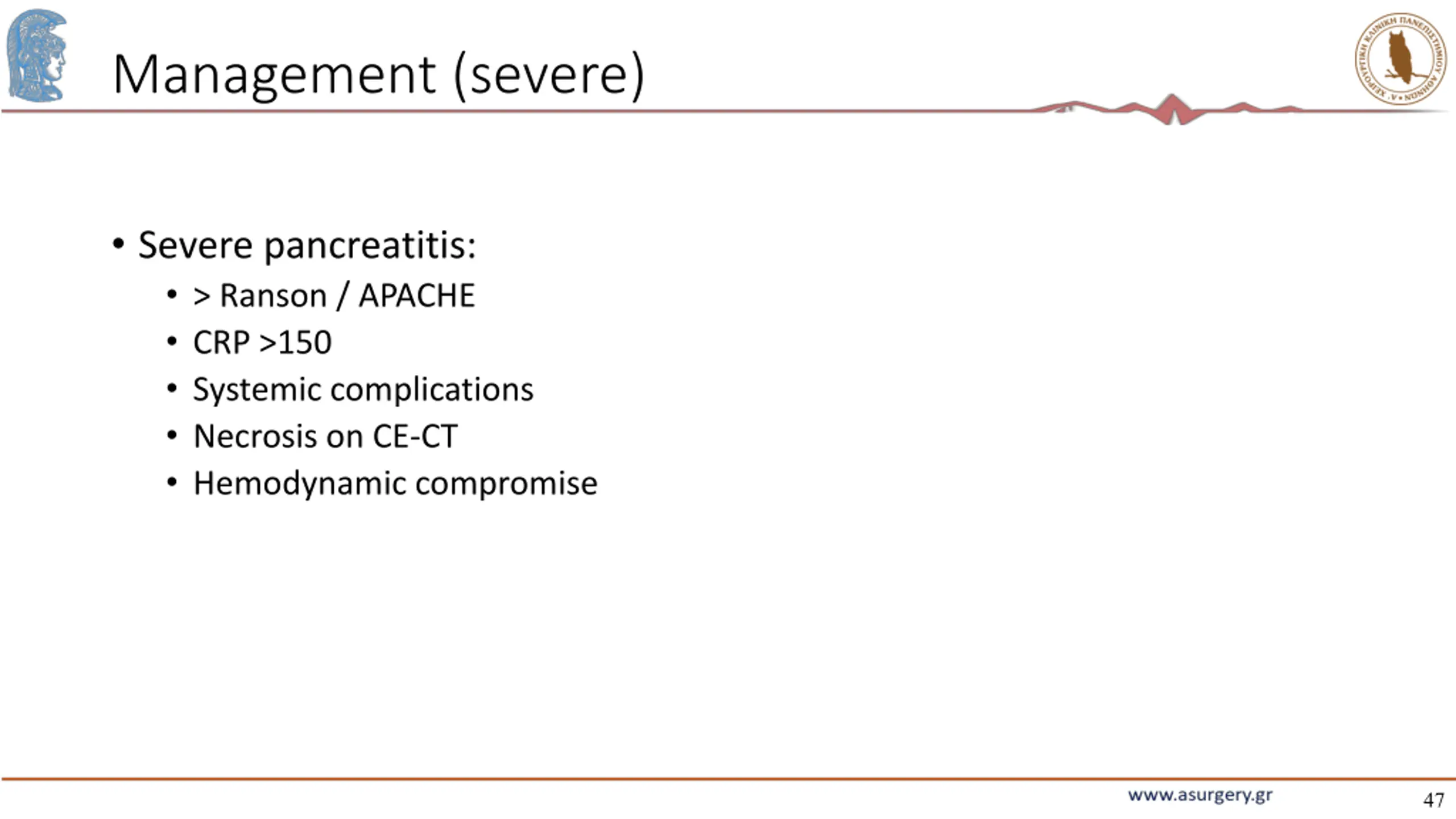 Management (severe) Severe pancreatitis: > Ranson / APACHE CRP >150 Systemic complications Necrosis on CE-CT Hemodynamic compromise 47