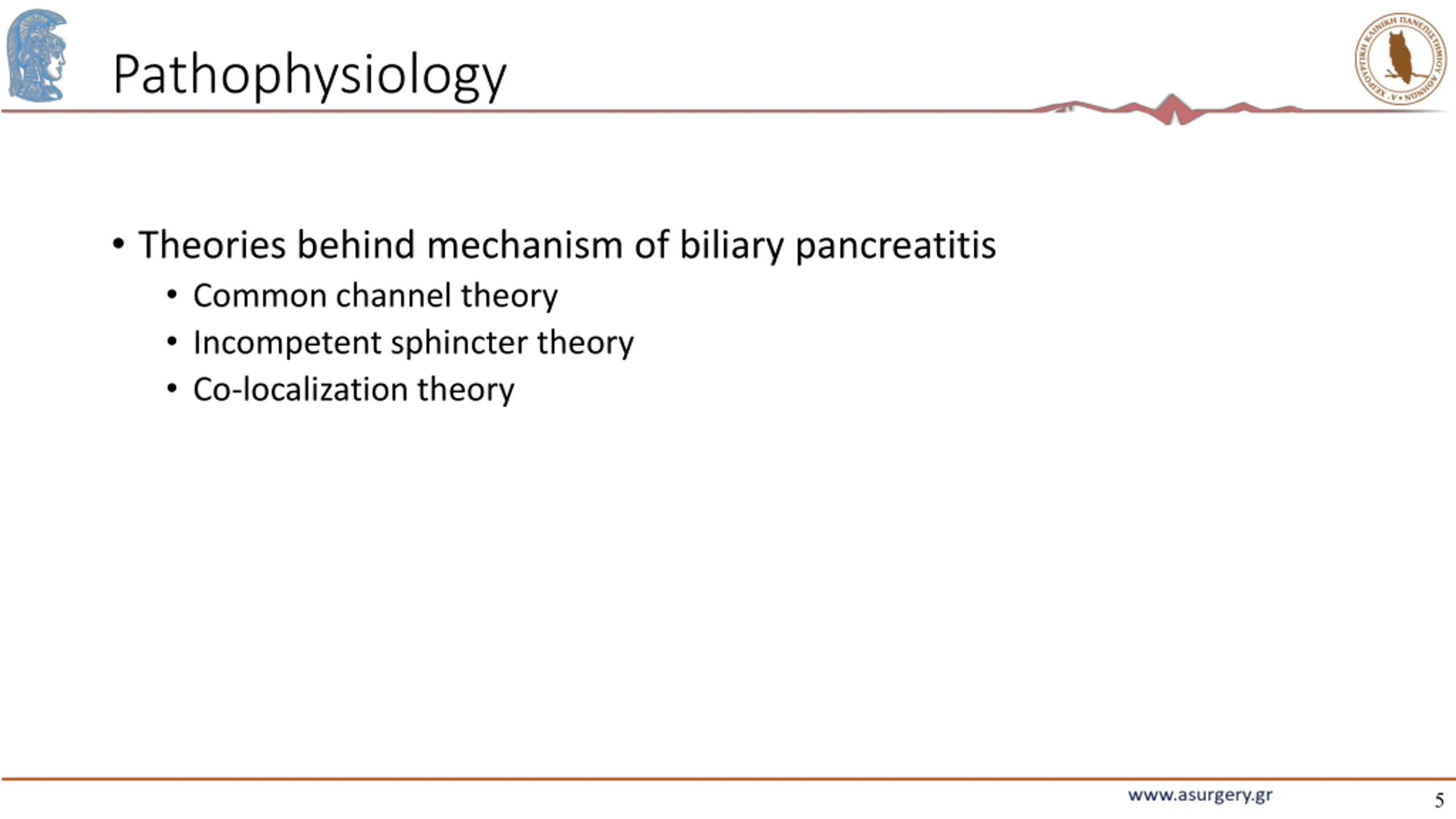 Pathophysiology Theories behind mechanism of biliary pancreatitis Common channel theory Incompetent sphincter theory Co-localization theory 5