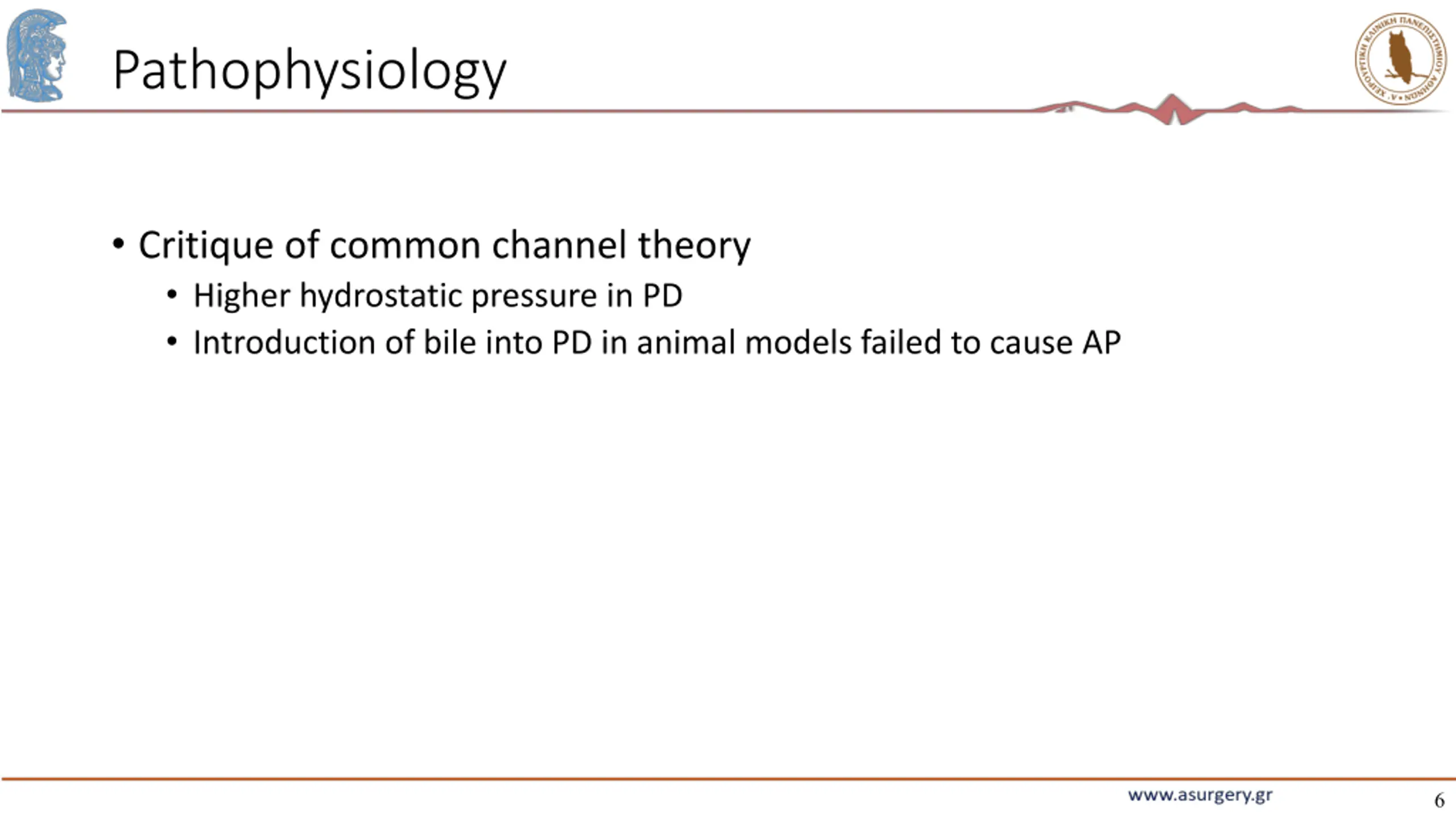 Pathophysiology Critique of common channel theory Higher hydrostatic pressure in PD Introduction of bile into PD in animal models failed to cause AP 6