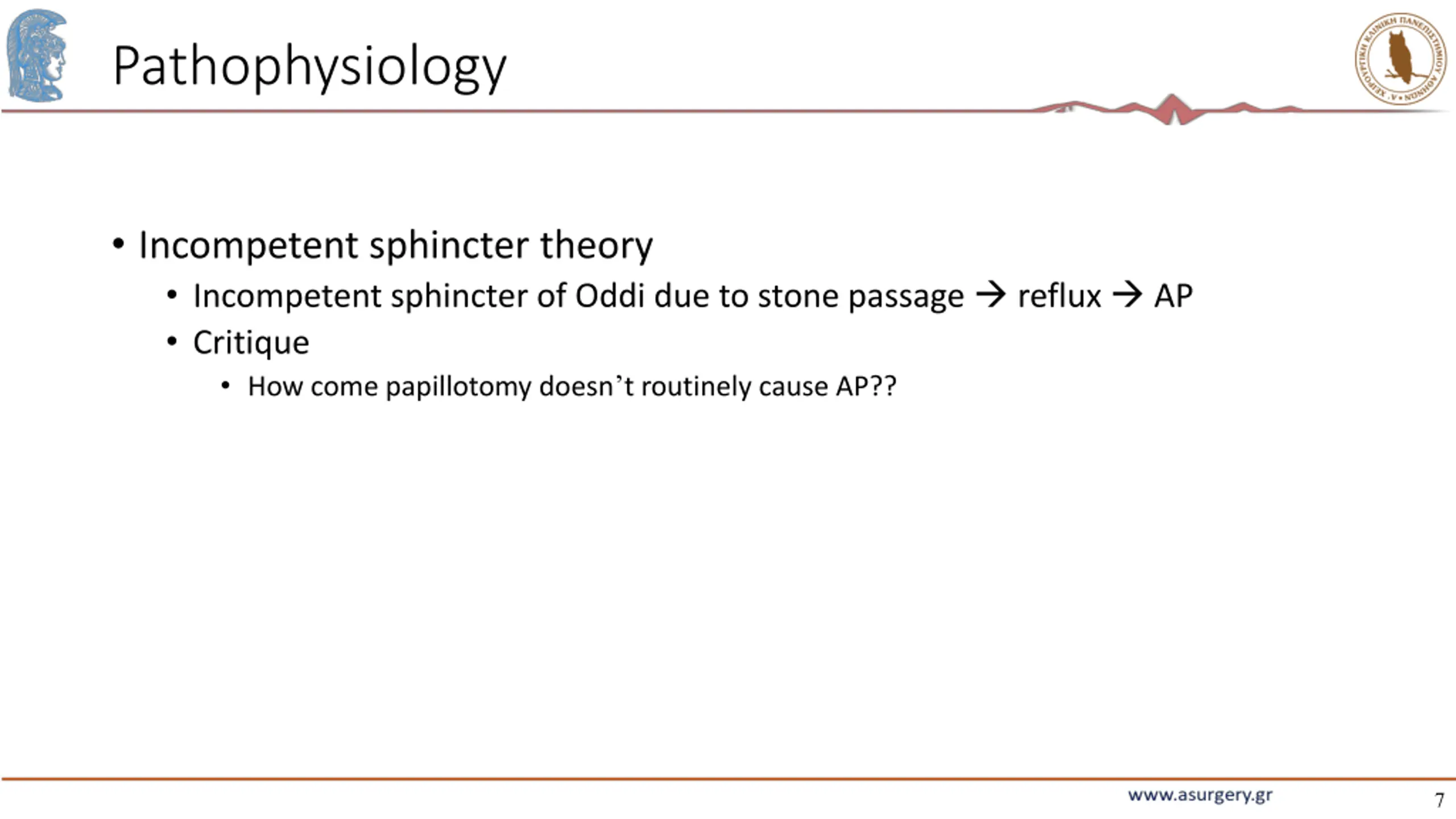 Pathophysiology Incompetent sphincter theory Incompetent sphincter of Oddi due to stone passage reflux AP Critique How come papillotomy doesn t routinely cause AP?? 7