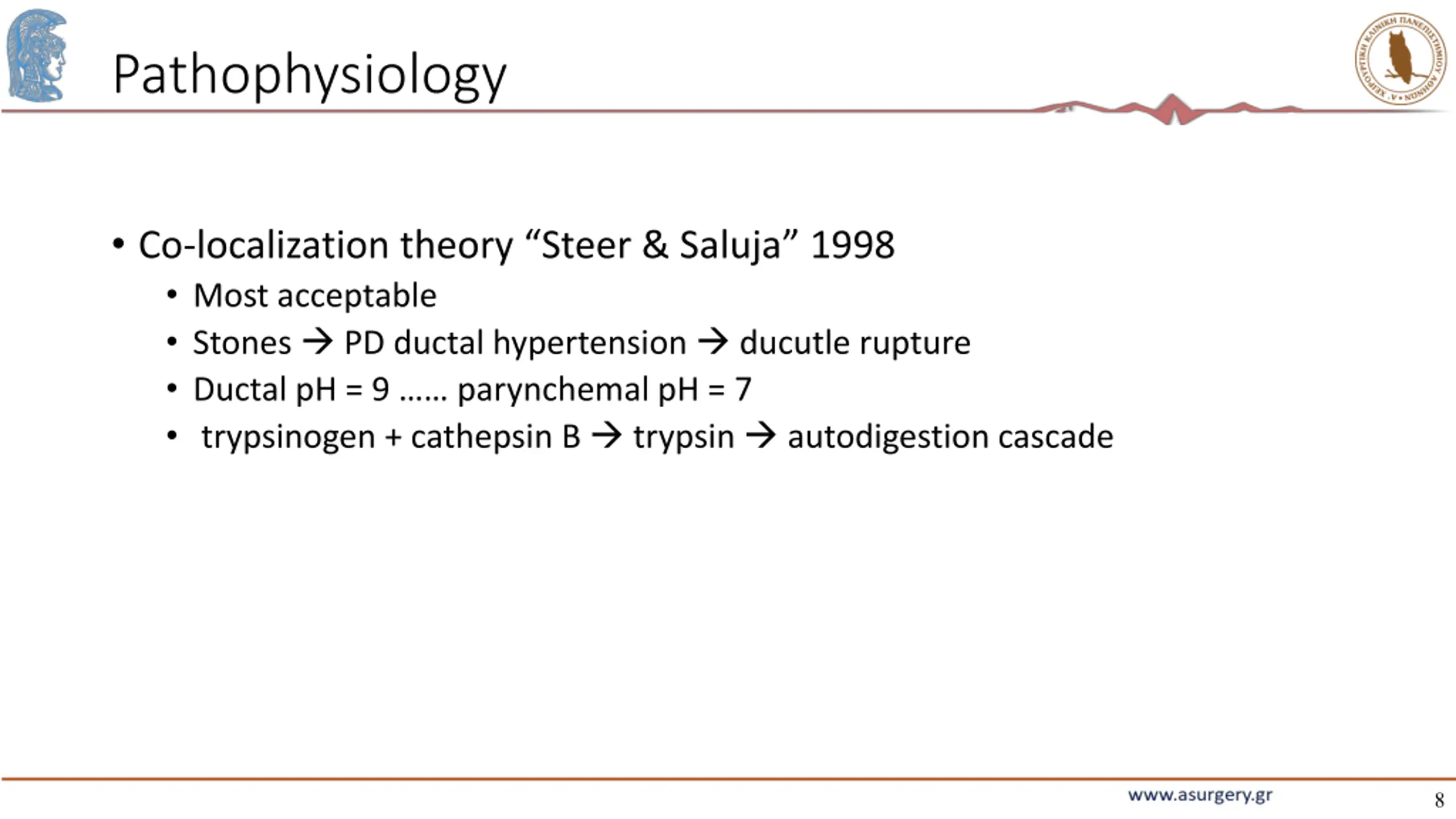 Pathophysiology Co-localization theory Steer & Saluja 1998 Most acceptable Stones PD ductal hypertension ducutle rupture Ductal pH = 9 parynchemal pH = 7 trypsinogen + cathepsin B trypsin autodigestion cascade 8