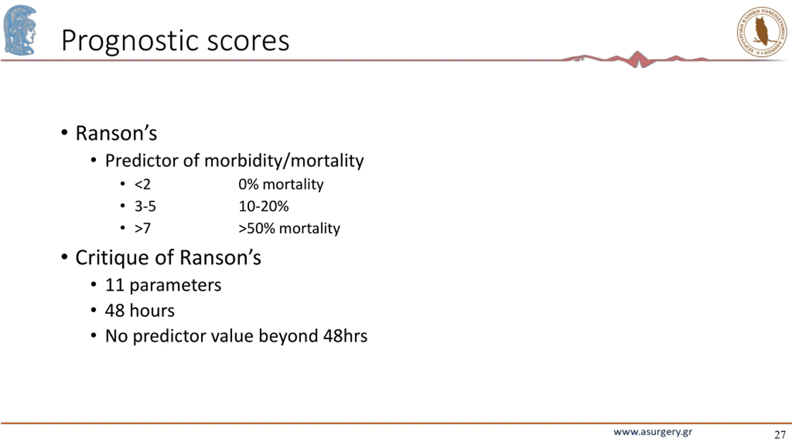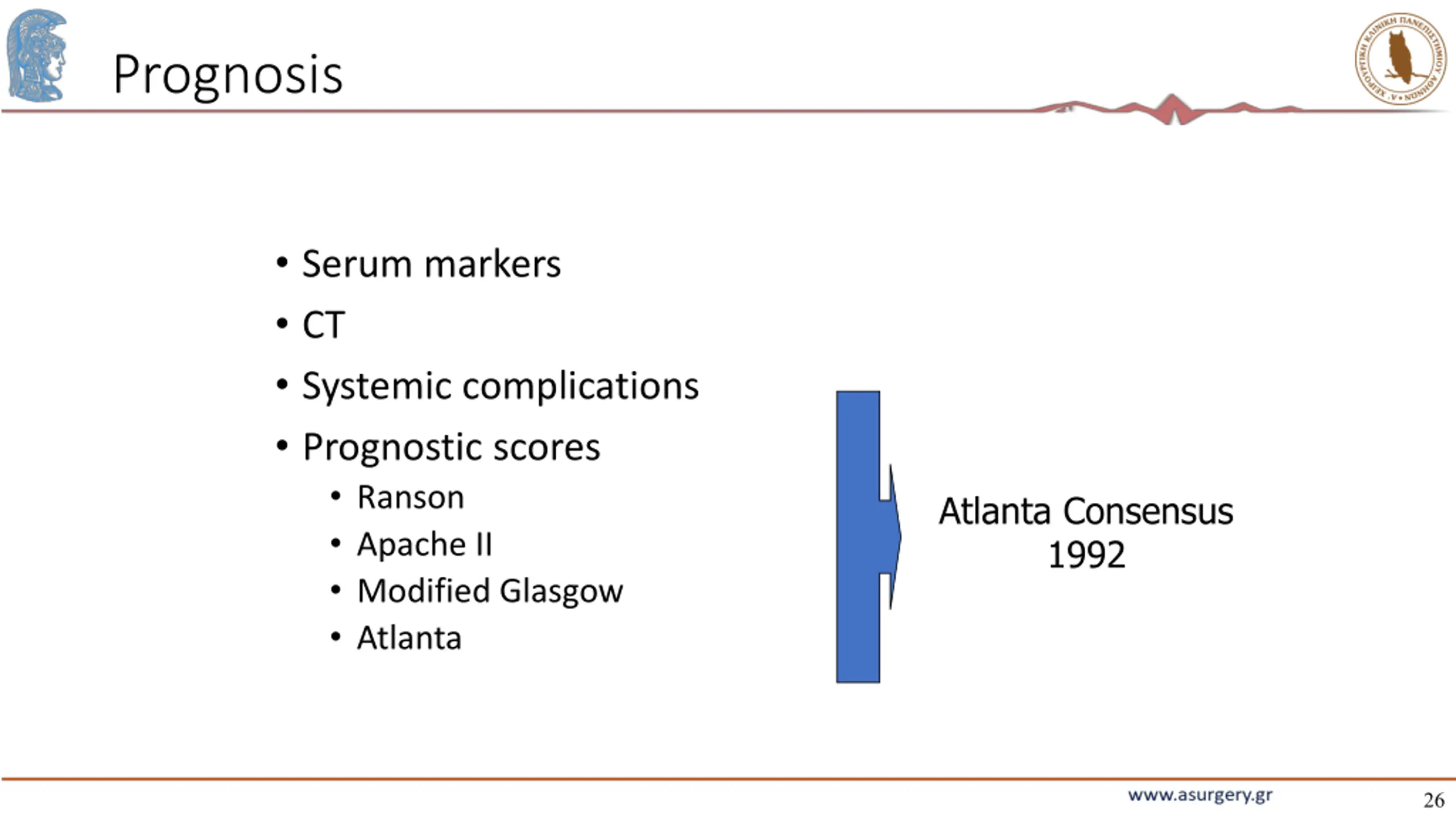 Prognosis Serum markers CT Systemic complications Prognostic scores Ranson Apache II Modified Glasgow Atlanta Atlanta Consensus 1992 26