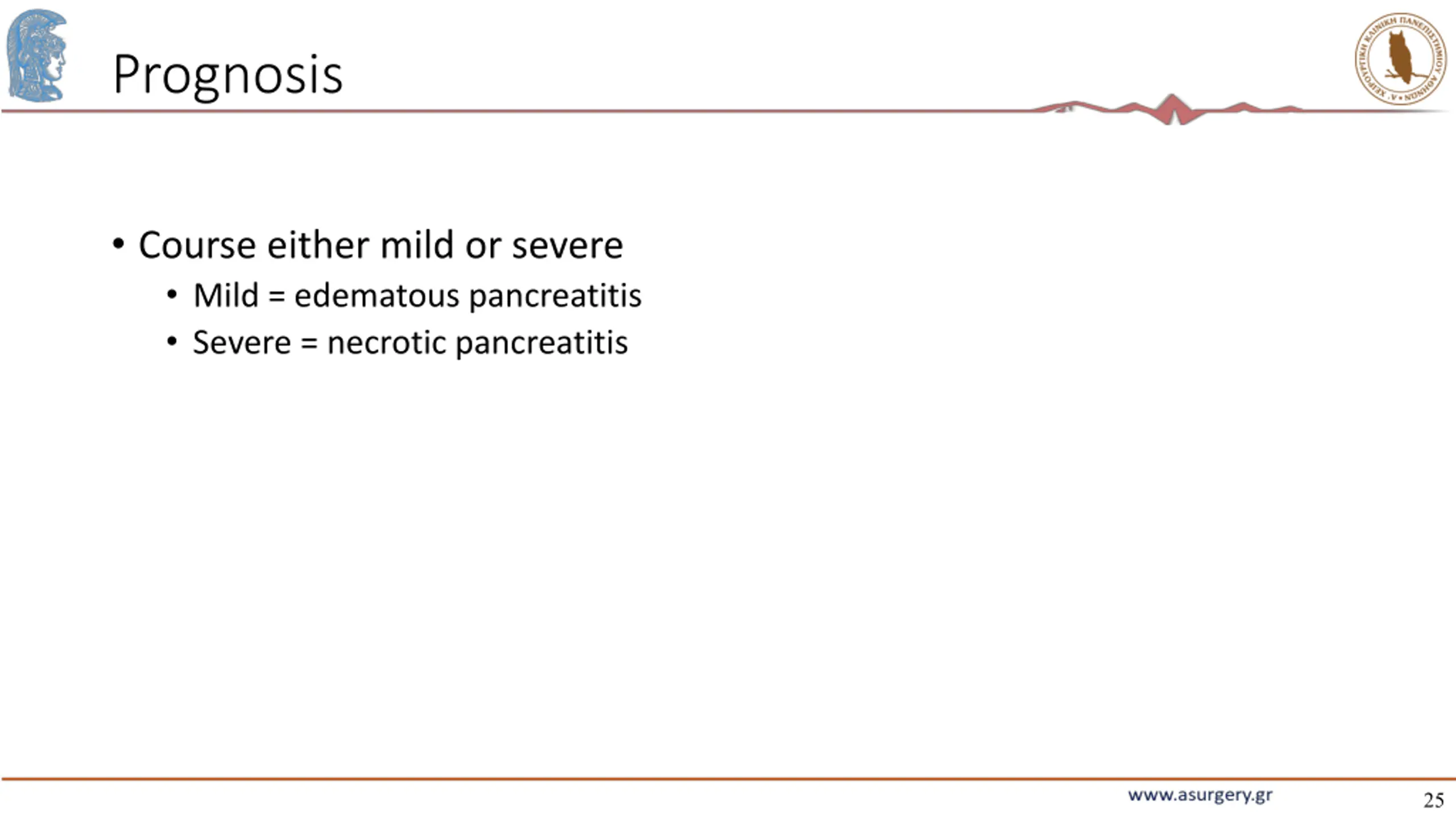 Prognosis Course either mild or severe Mild = edematous pancreatitis Severe = necrotic pancreatitis 25