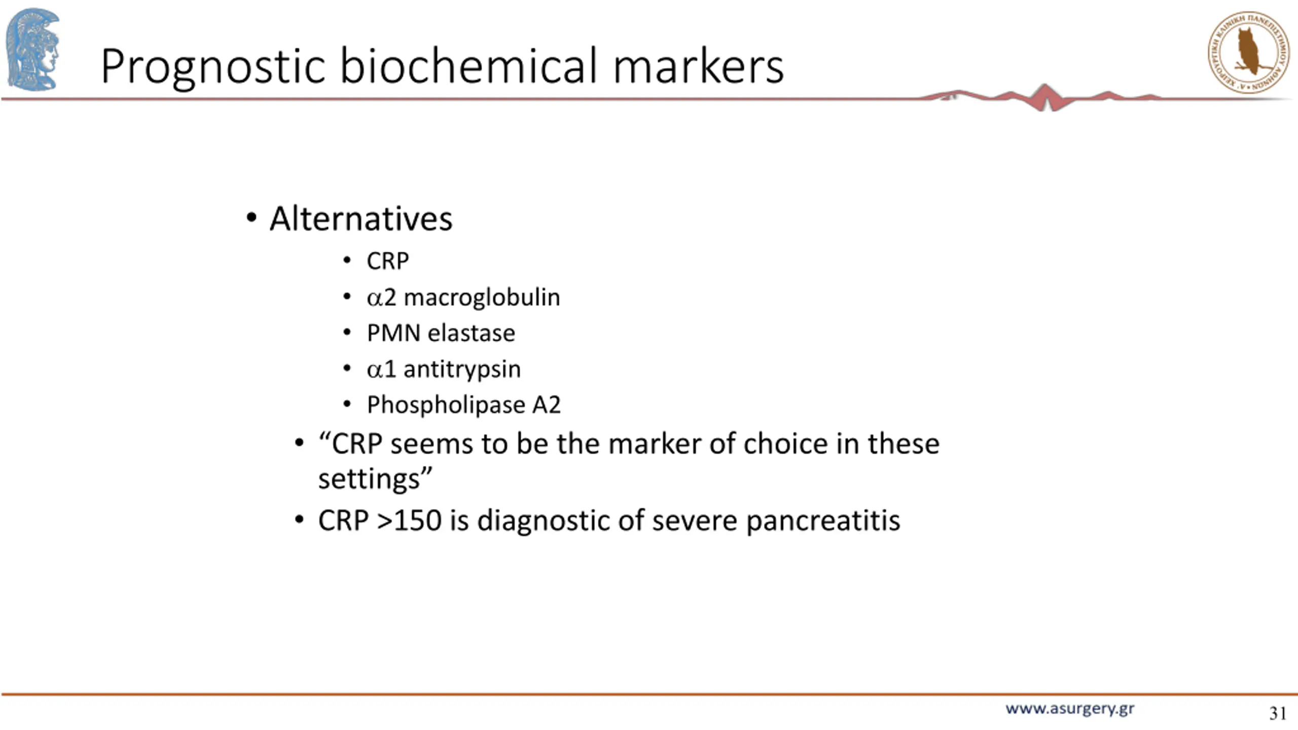 Prognostic biochemical markers Alternatives CRP 2 macroglobulin PMN elastase 1 antitrypsin Phospholipase A2 CRP seems to be the marker of choice in these settings CRP >150 is diagnostic of severe pancreatitis 31