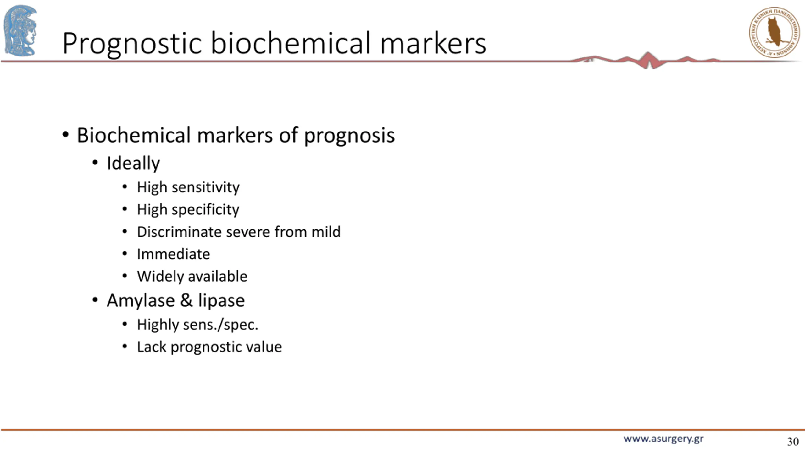 Prognostic biochemical markers Biochemical markers of prognosis Ideally High sensitivity High specificity Discriminate severe from mild Immediate Widely available Amylase & lipase Highly sens./spec. Lack prognostic value 30