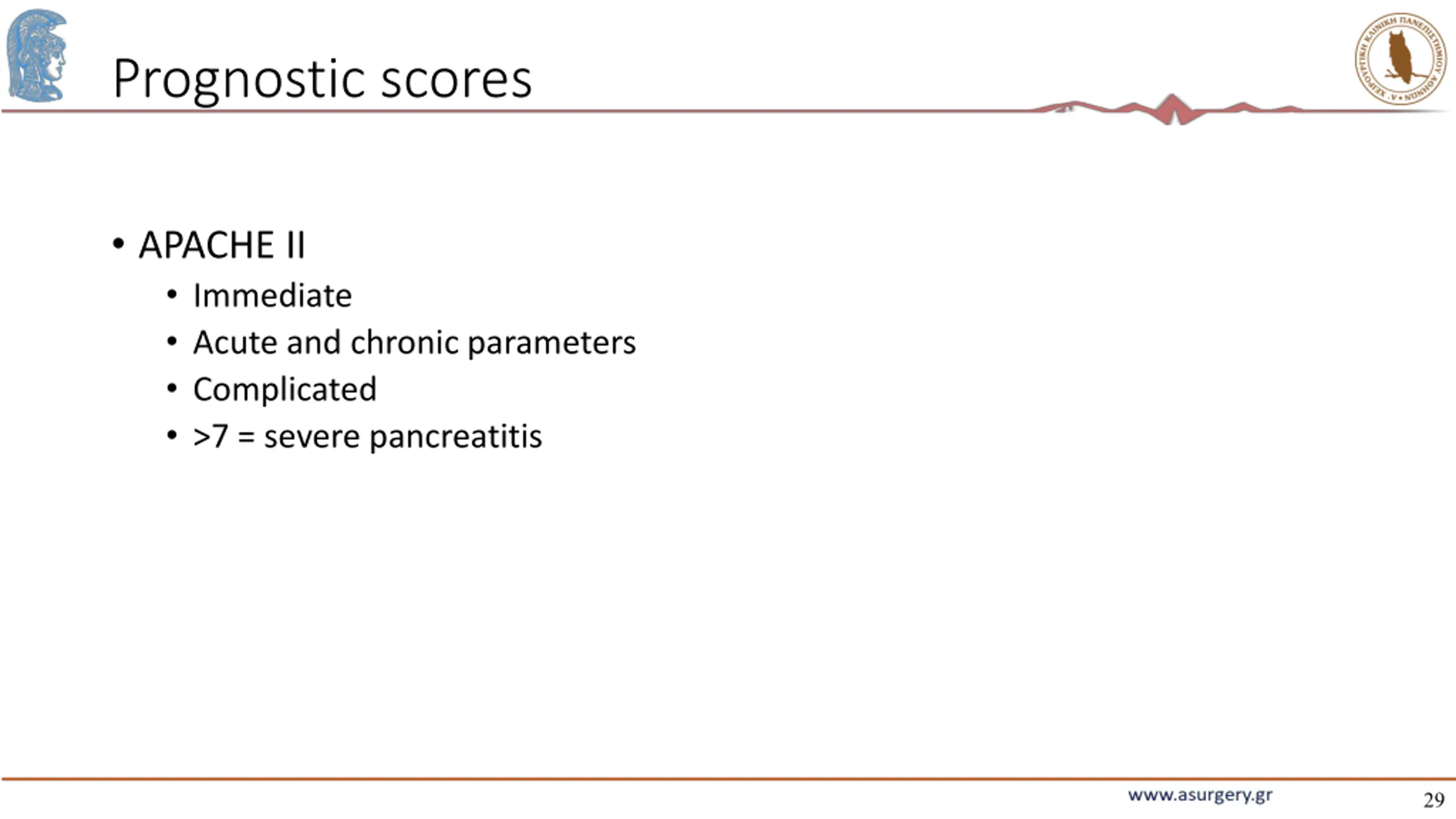 Prognostic scores APACHE II Immediate Acute and chronic parameters Complicated >7 = severe pancreatitis 29