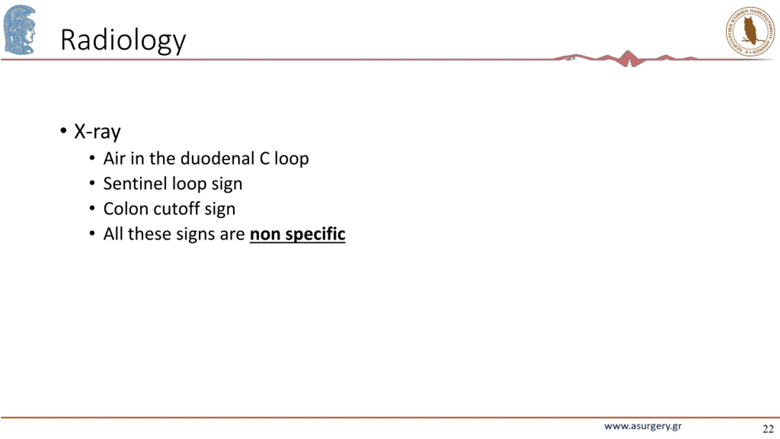 Radiology X-ray Air in the duodenal C loop Sentinel loop sign Colon cutoff sign All these signs are non specific 22