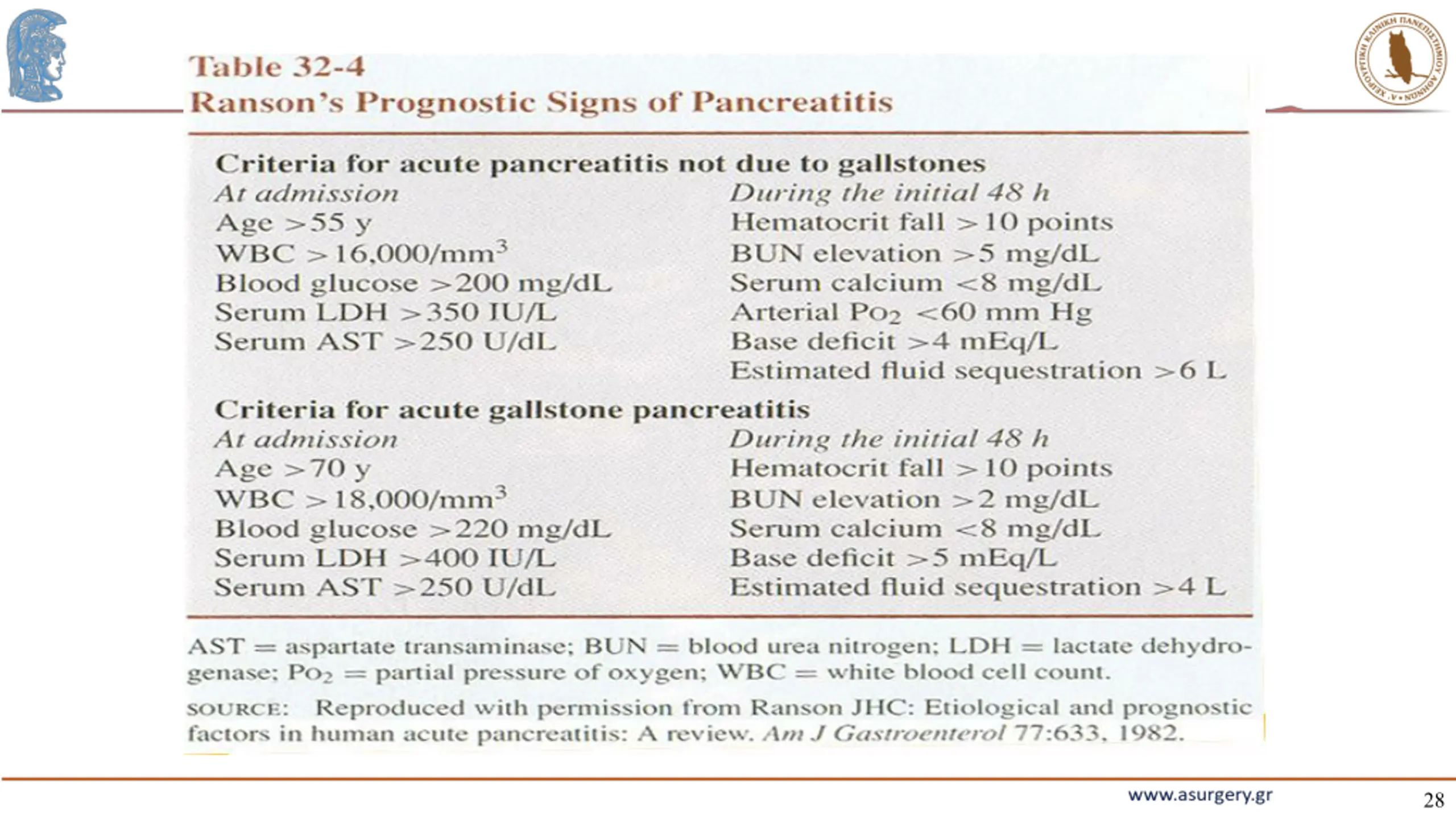 Prognostic scores Ranson s Predictor of morbidity/mortality <2 3-5 >7 Critique of Ranson s 11 parameters 48 hours No predictor value beyond 48hrs 0% mortality 10-20% >50% mortality 27