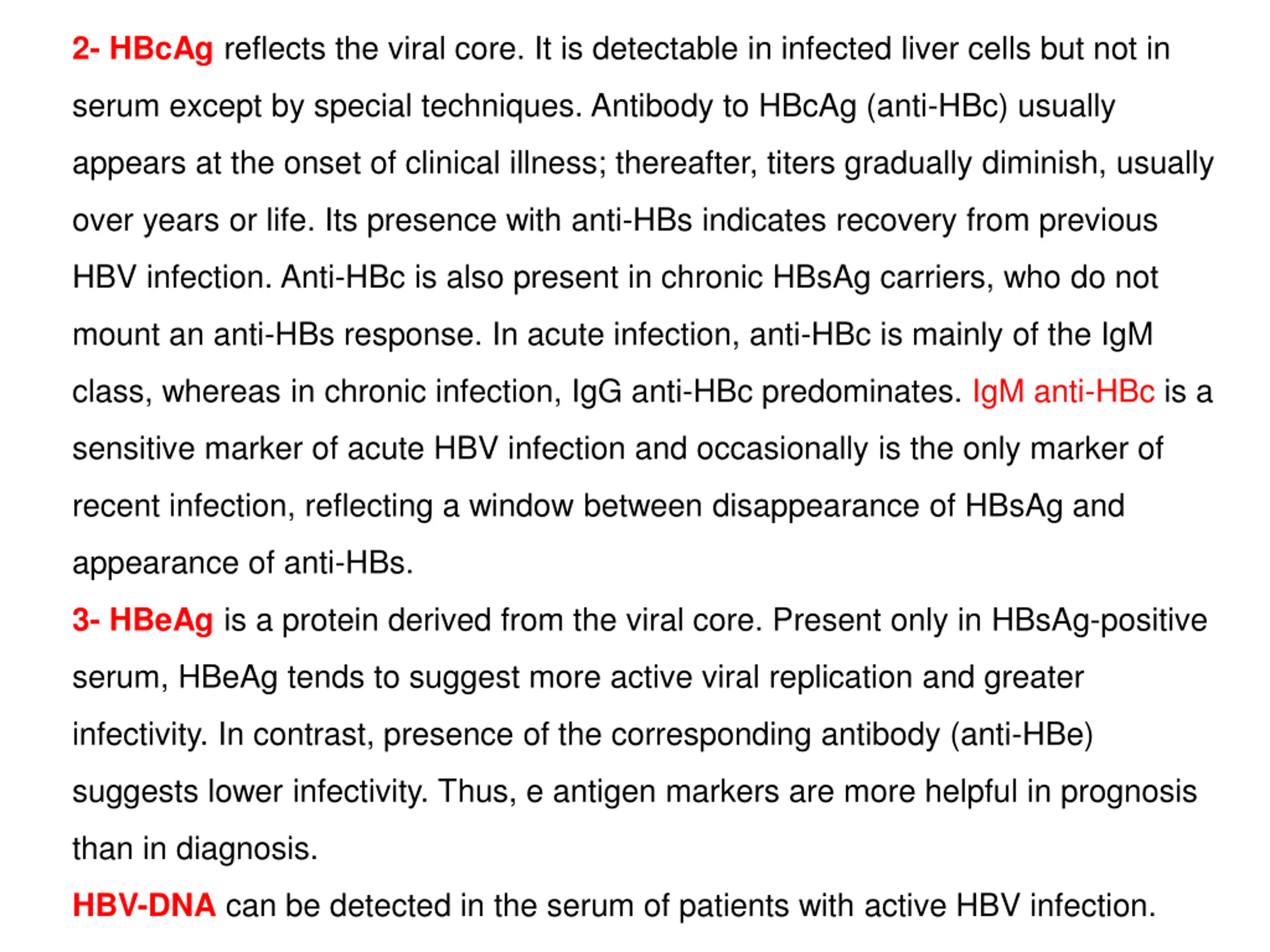 2- HBcAg reflects the viral core. It is detectable in infected liver cells but not in serum except by special techniques. Antibody to HBcAg (anti-HBc) usually appears at the onset of clinical illness; thereafter, titers gradually diminish, usually over years or life. Its presence with anti-HBs indicates recovery from previous HBV infection. Anti-HBc is also present in chronic HBsAg carriers, who do not mount an anti-HBs response. In acute infection, anti-HBc is mainly of the IgM class, whereas in chronic infection, IgG anti-HBc predominates. IgM anti-HBc is a sensitive marker of acute HBV infection and occasionally is the only marker of recent infection, reflecting a window between disappearance of HBsAg and appearance of anti-HBs. 3- HBeAg is a protein derived from the viral core. Present only in HBsAg-positive serum, HBeAg tends to suggest more active viral replication and greater infectivity. In contrast, presence of the corresponding antibody (anti-HBe) suggests lower infectivity. Thus, e antigen markers are more helpful in prognosis than in diagnosis. HBV-DNA can be detected in the serum of patients with active HBV infection.
