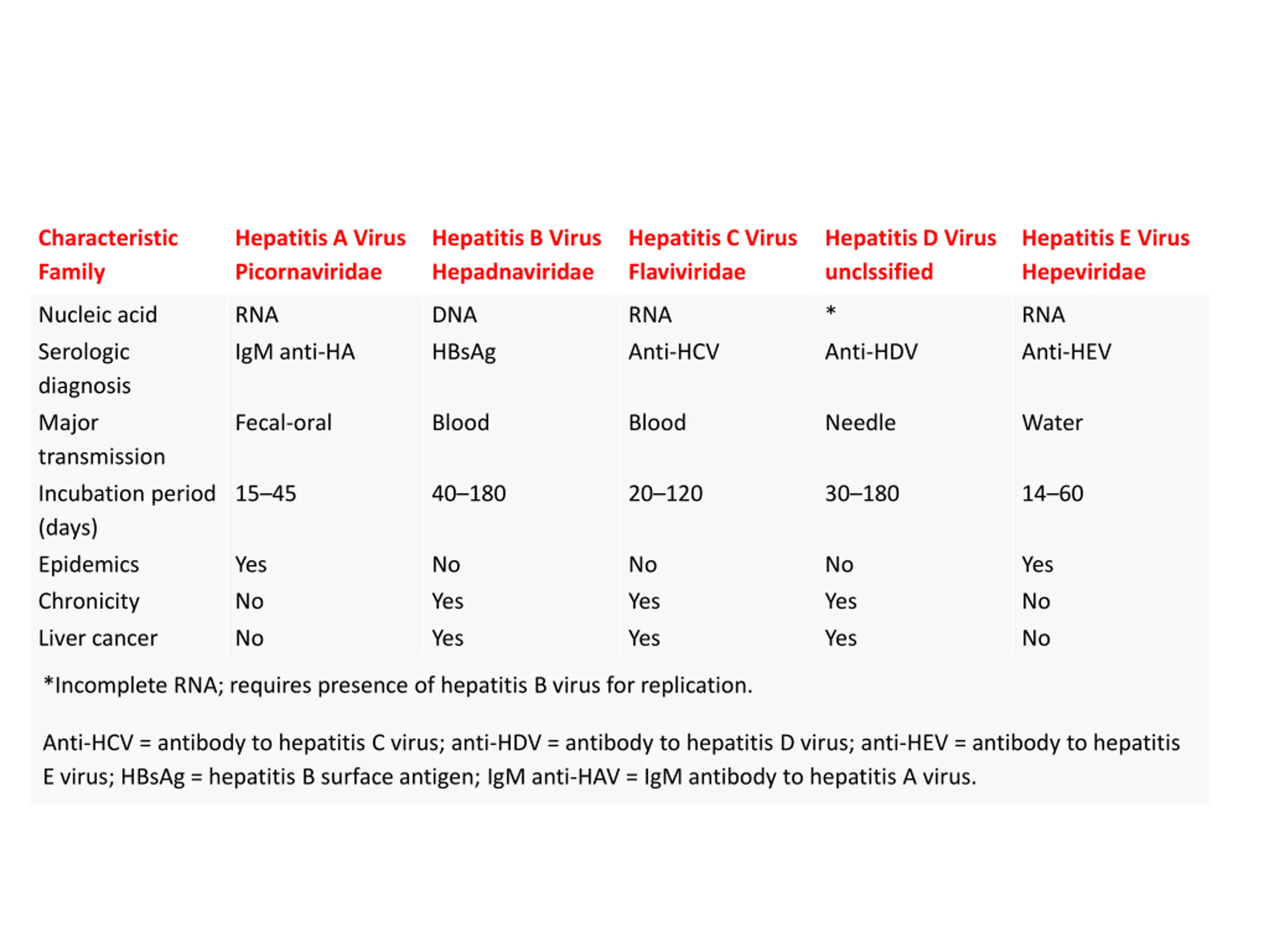 Characteristic Family Hepatitis A Virus Picornaviridae Hepatitis B Virus Hepadnaviridae Hepatitis C Virus Flaviviridae Hepatitis D Virus unclssified Hepatitis E Virus Hepeviridae Nucleic acid Serologic diagnosis Major transmission Incubation period (days) Epidemics Chronicity Liver cancer RNA IgM anti-HA DNA HBsAg RNA Anti-HCV * Anti-HDV RNA Anti-HEV Fecal-oral Blood Blood Needle Water 15 45 40 180 20 120 30 180 14 60 Yes No No No Yes Yes No Yes Yes No Yes Yes Yes No No *Incomplete RNA; requires presence of hepatitis B virus for replication. Anti-HCV = antibody to hepatitis C virus; anti-HDV = antibody to hepatitis D virus; anti-HEV = antibody to hepatitis E virus; HBsAg = hepatitis B surface antigen; IgM anti-HAV = IgM antibody to hepatitis A virus.