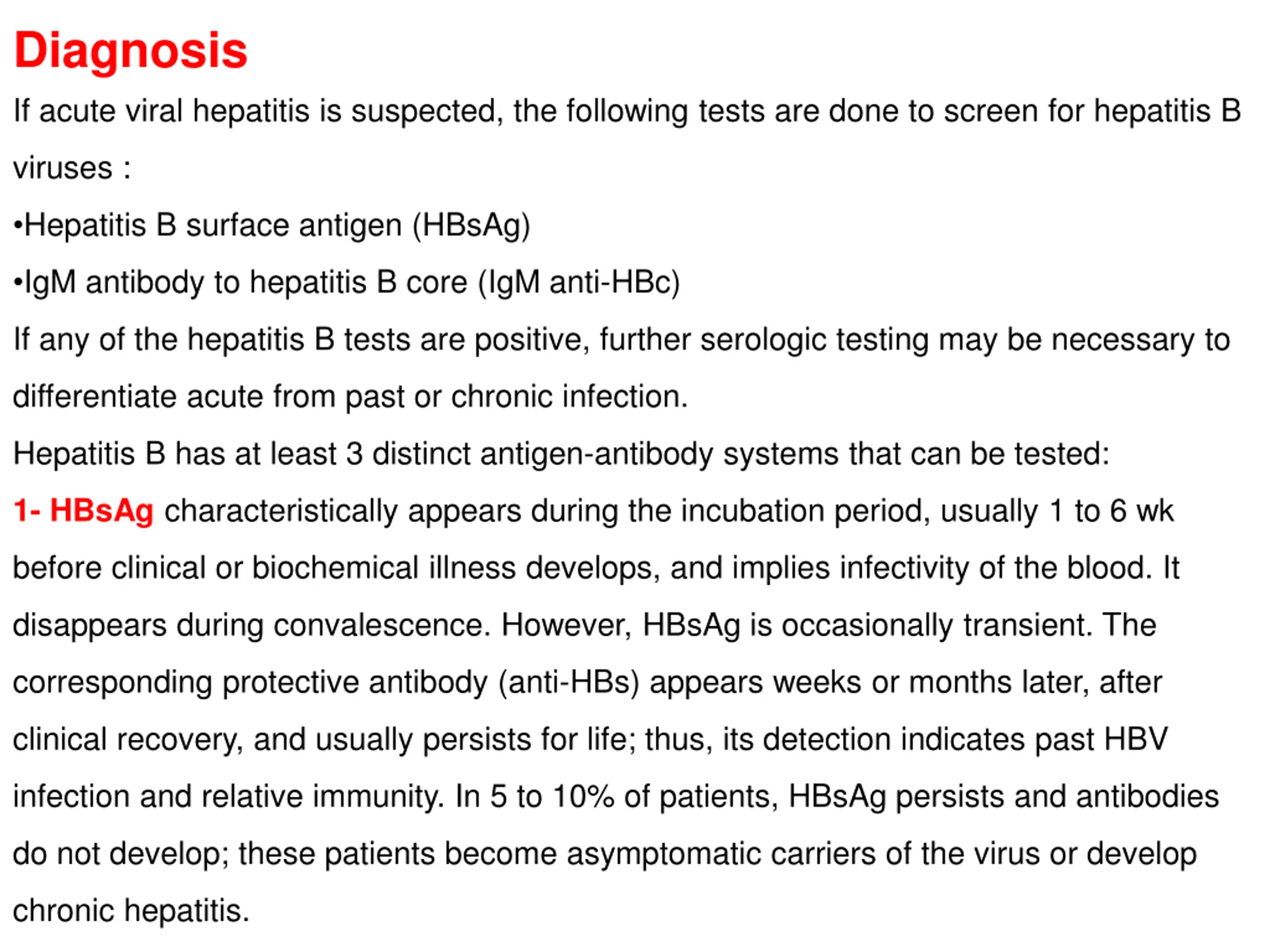 Diagnosis If acute viral hepatitis is suspected, the following tests are done to screen for hepatitis B viruses : Hepatitis B surface antigen (HBsAg) IgM antibody to hepatitis B core (IgM anti-HBc) If any of the hepatitis B tests are positive, further serologic testing may be necessary to differentiate acute from past or chronic infection. Hepatitis B has at least 3 distinct antigen-antibody systems that can be tested: 1- HBsAg characteristically appears during the incubation period, usually 1 to 6 wk before clinical or biochemical illness develops, and implies infectivity of the blood. It disappears during convalescence. However, HBsAg is occasionally transient. The corresponding protective antibody (anti-HBs) appears weeks or months later, after clinical recovery, and usually persists for life; thus, its detection indicates past HBV infection and relative immunity. In 5 to 10% of patients, HBsAg persists and antibodies do not develop; these patients become asymptomatic carriers of the virus or develop chronic hepatitis.