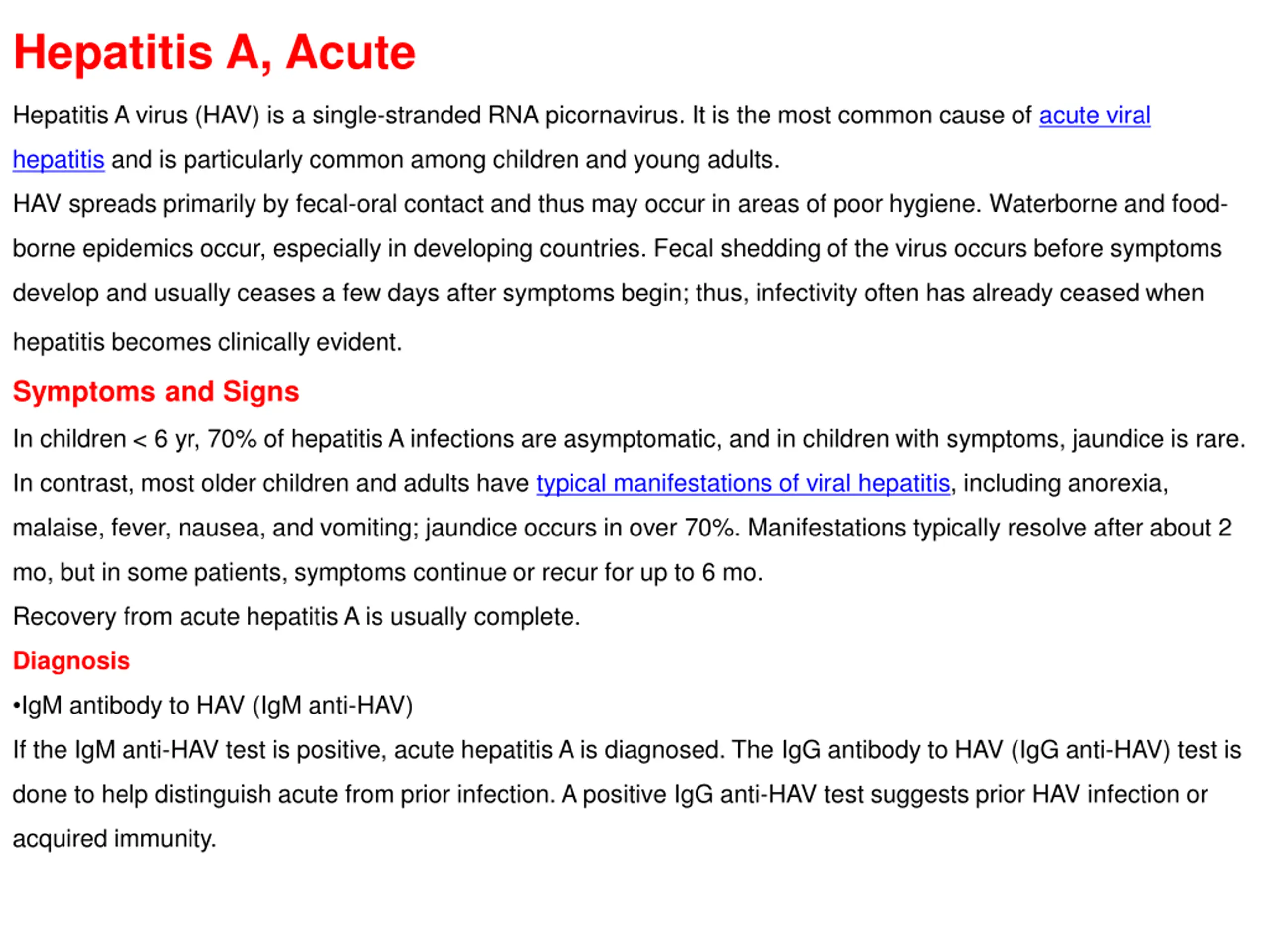 Hepatitis A, Acute Hepatitis A virus (HAV) is a single-stranded RNA picornavirus. It is the most common cause of acute viral hepatitis and is particularly common among children and young adults. HAV spreads primarily by fecal-oral contact and thus may occur in areas of poor hygiene. Waterborne and food- borne epidemics occur, especially in developing countries. Fecal shedding of the virus occurs before symptoms develop and usually ceases a few days after symptoms begin; thus, infectivity often has already ceased when hepatitis becomes clinically evident. Symptoms and Signs In children < 6 yr, 70% of hepatitis A infections are asymptomatic, and in children with symptoms, jaundice is rare. In contrast, most older children and adults have typical manifestations of viral hepatitis, including anorexia, malaise, fever, nausea, and vomiting; jaundice occurs in over 70%. Manifestations typically resolve after about 2 mo, but in some patients, symptoms continue or recur for up to 6 mo. Recovery from acute hepatitis A is usually complete. Diagnosis IgM antibody to HAV (IgM anti-HAV) If the IgM anti-HAV test is positive, acute hepatitis A is diagnosed. The IgG antibody to HAV (IgG anti-HAV) test is done to help distinguish acute from prior infection. A positive IgG anti-HAV test suggests prior HAV infection or acquired immunity.