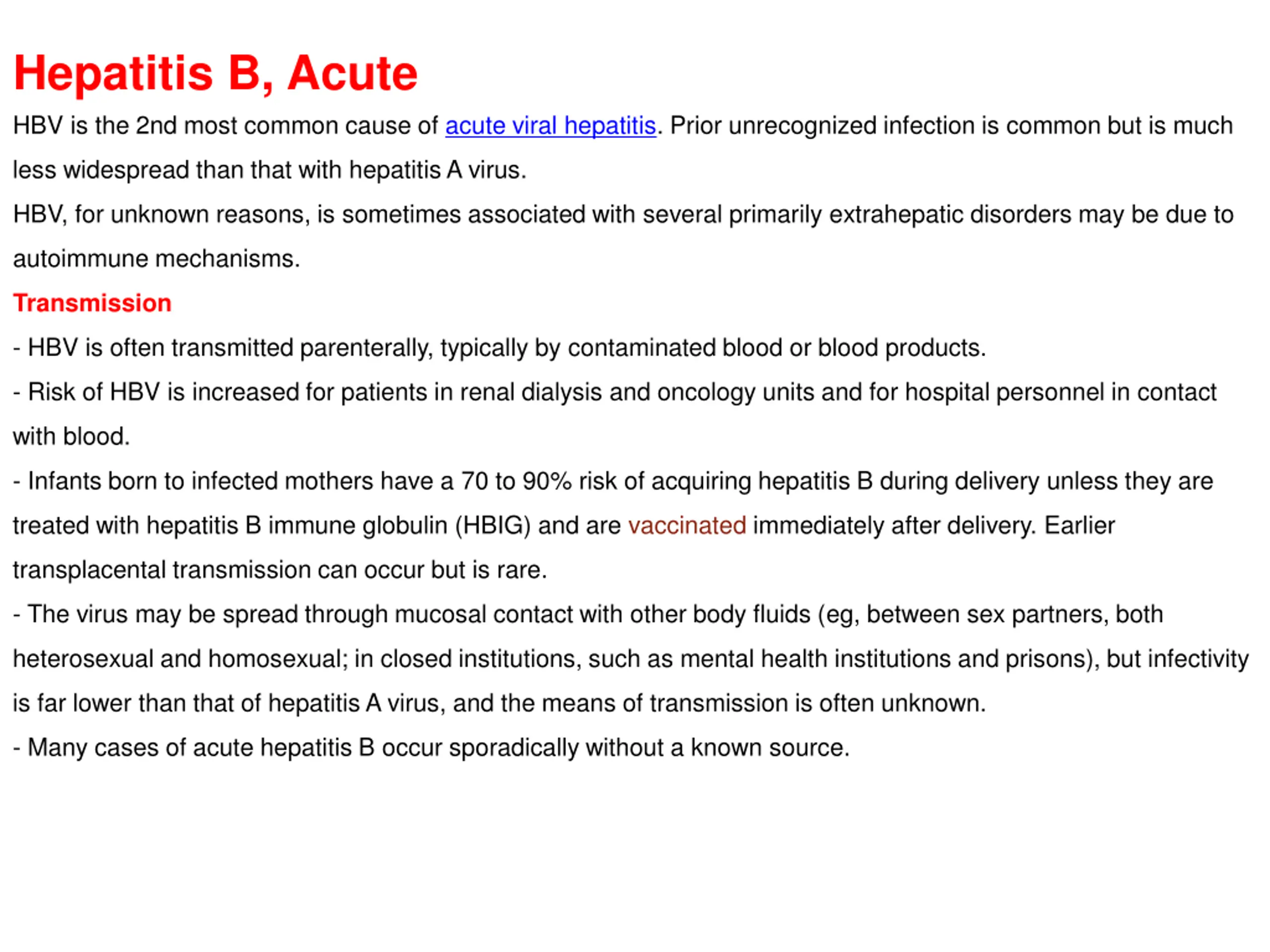Hepatitis B, Acute HBV is the 2nd most common cause of acute viral hepatitis. Prior unrecognized infection is common but is much less widespread than that with hepatitis A virus. HBV, for unknown reasons, is sometimes associated with several primarily extrahepatic disorders may be due to autoimmune mechanisms. Transmission - HBV is often transmitted parenterally, typically by contaminated blood or blood products. - Risk of HBV is increased for patients in renal dialysis and oncology units and for hospital personnel in contact with blood. - Infants born to infected mothers have a 70 to 90% risk of acquiring hepatitis B during delivery unless they are treated with hepatitis B immune globulin (HBIG) and are vaccinated immediately after delivery. Earlier transplacental transmission can occur but is rare. - The virus may be spread through mucosal contact with other body fluids (eg, between sex partners, both heterosexual and homosexual; in closed institutions, such as mental health institutions and prisons), but infectivity is far lower than that of hepatitis A virus, and the means of transmission is often unknown. - Many cases of acute hepatitis B occur sporadically without a known source.