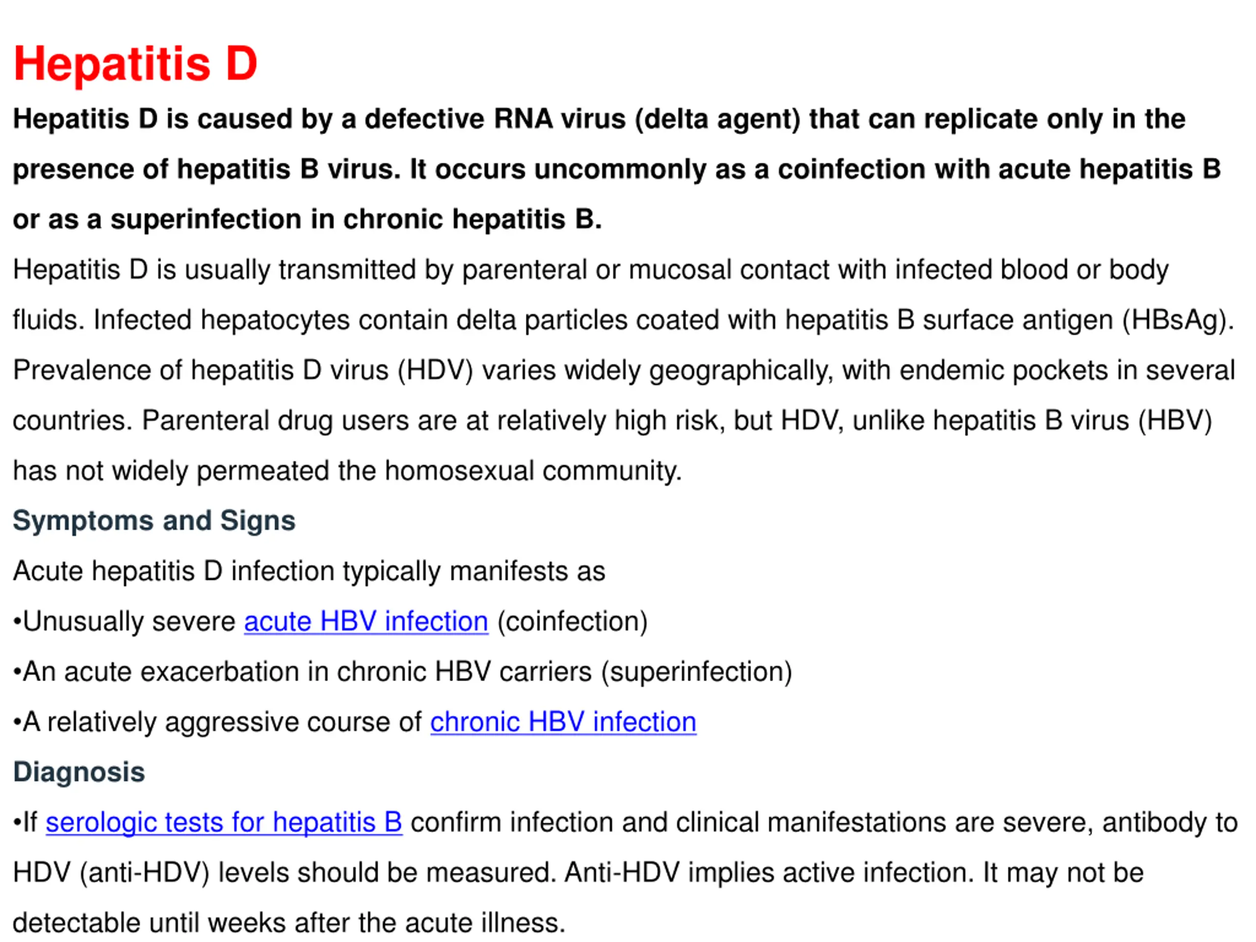 Hepatitis D Hepatitis D is caused by a defective RNA virus (delta agent) that can replicate only in the presence of hepatitis B virus. It occurs uncommonly as a coinfection with acute hepatitis B or as a superinfection in chronic hepatitis B. Hepatitis D is usually transmitted by parenteral or mucosal contact with infected blood or body fluids. Infected hepatocytes contain delta particles coated with hepatitis B surface antigen (HBsAg). Prevalence of hepatitis D virus (HDV) varies widely geographically, with endemic pockets in several countries. Parenteral drug users are at relatively high risk, but HDV, unlike hepatitis B virus (HBV) has not widely permeated the homosexual community. Symptoms and Signs Acute hepatitis D infection typically manifests as Unusually severe acute HBV infection (coinfection) An acute exacerbation in chronic HBV carriers (superinfection) A relatively aggressive course of chronic HBV infection Diagnosis If serologic tests for hepatitis B confirm infection and clinical manifestations are severe, antibody to HDV (anti-HDV) levels should be measured. Anti-HDV implies active infection. It may not be detectable until weeks after the acute illness.