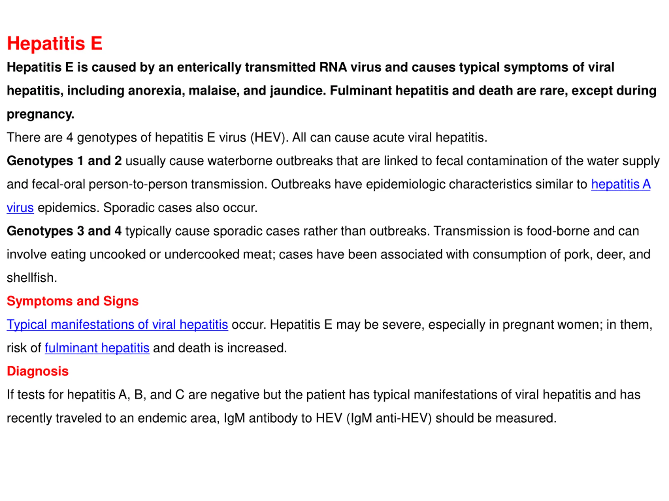 Hepatitis E Hepatitis E is caused by an enterically transmitted RNA virus and causes typical symptoms of viral hepatitis, including anorexia, malaise, and jaundice. Fulminant hepatitis and death are rare, except during pregnancy. There are 4 genotypes of hepatitis E virus (HEV). All can cause acute viral hepatitis. Genotypes 1 and 2 usually cause waterborne outbreaks that are linked to fecal contamination of the water supply and fecal-oral person-to-person transmission. Outbreaks have epidemiologic characteristics similar to hepatitis A virus epidemics. Sporadic cases also occur. Genotypes 3 and 4 typically cause sporadic cases rather than outbreaks. Transmission is food-borne and can involve eating uncooked or undercooked meat; cases have been associated with consumption of pork, deer, and shellfish. Symptoms and Signs Typical manifestations of viral hepatitis occur. Hepatitis E may be severe, especially in pregnant women; in them, risk of fulminant hepatitis and death is increased. Diagnosis If tests for hepatitis A, B, and C are negative but the patient has typical manifestations of viral hepatitis and has recently traveled to an endemic area, IgM antibody to HEV (IgM anti-HEV) should be measured.