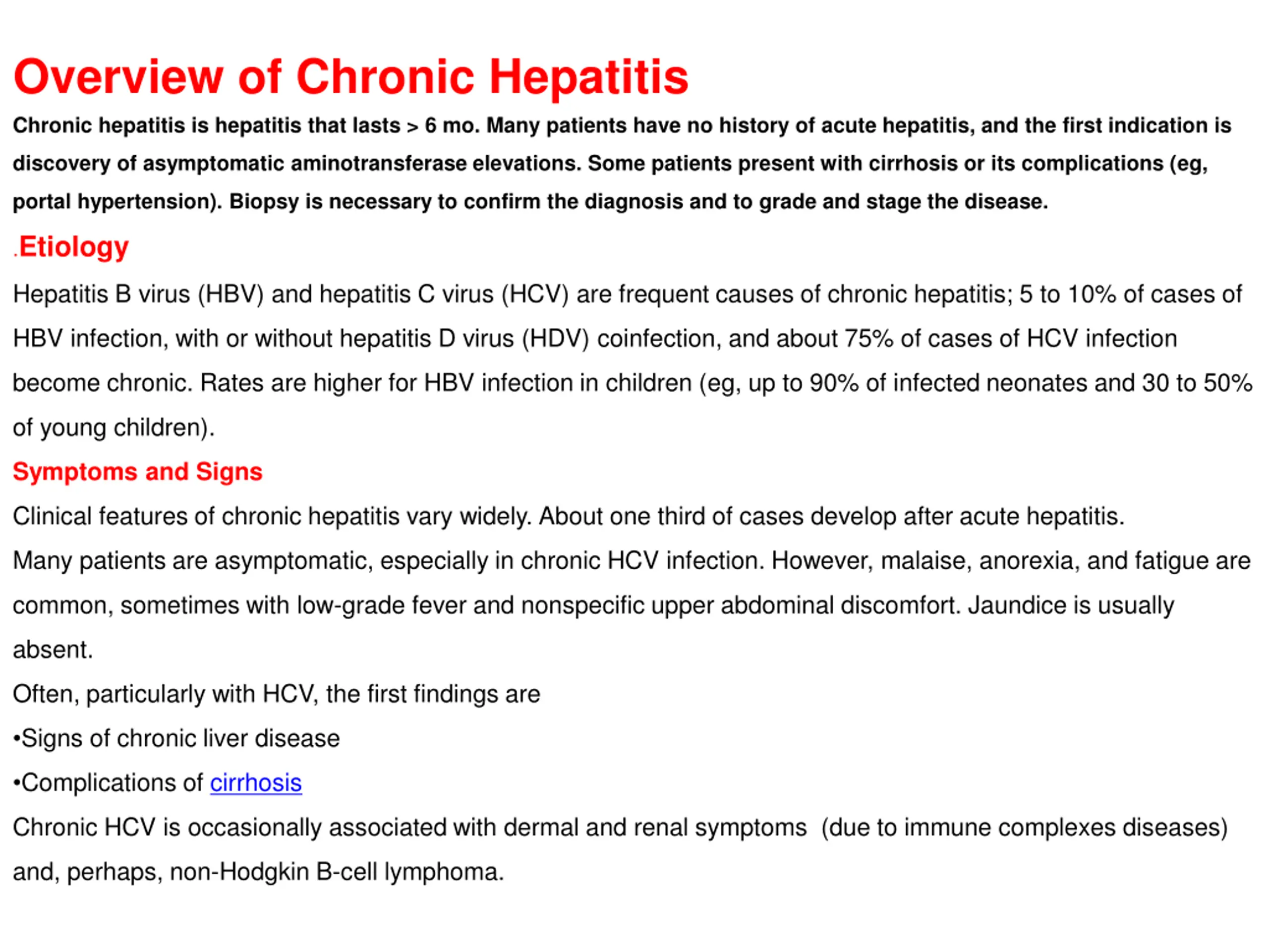 Overview of Chronic Hepatitis Chronic hepatitis is hepatitis that lasts > 6 mo. Many patients have no history of acute hepatitis, and the first indication is discovery of asymptomatic aminotransferase elevations. Some patients present with cirrhosis or its complications (eg, portal hypertension). Biopsy is necessary to confirm the diagnosis and to grade and stage the disease. .Etiology Hepatitis B virus (HBV) and hepatitis C virus (HCV) are frequent causes of chronic hepatitis; 5 to 10% of cases of HBV infection, with or without hepatitis D virus (HDV) coinfection, and about 75% of cases of HCV infection become chronic. Rates are higher for HBV infection in children (eg, up to 90% of infected neonates and 30 to 50% of young children). Symptoms and Signs Clinical features of chronic hepatitis vary widely. About one third of cases develop after acute hepatitis. Many patients are asymptomatic, especially in chronic HCV infection. However, malaise, anorexia, and fatigue are common, sometimes with low-grade fever and nonspecific upper abdominal discomfort. Jaundice is usually absent. Often, particularly with HCV, the first findings are Signs of chronic liver disease Complications of cirrhosis Chronic HCV is occasionally associated with dermal and renal symptoms (due to immune complexes diseases) and, perhaps, non-Hodgkin B-cell lymphoma.