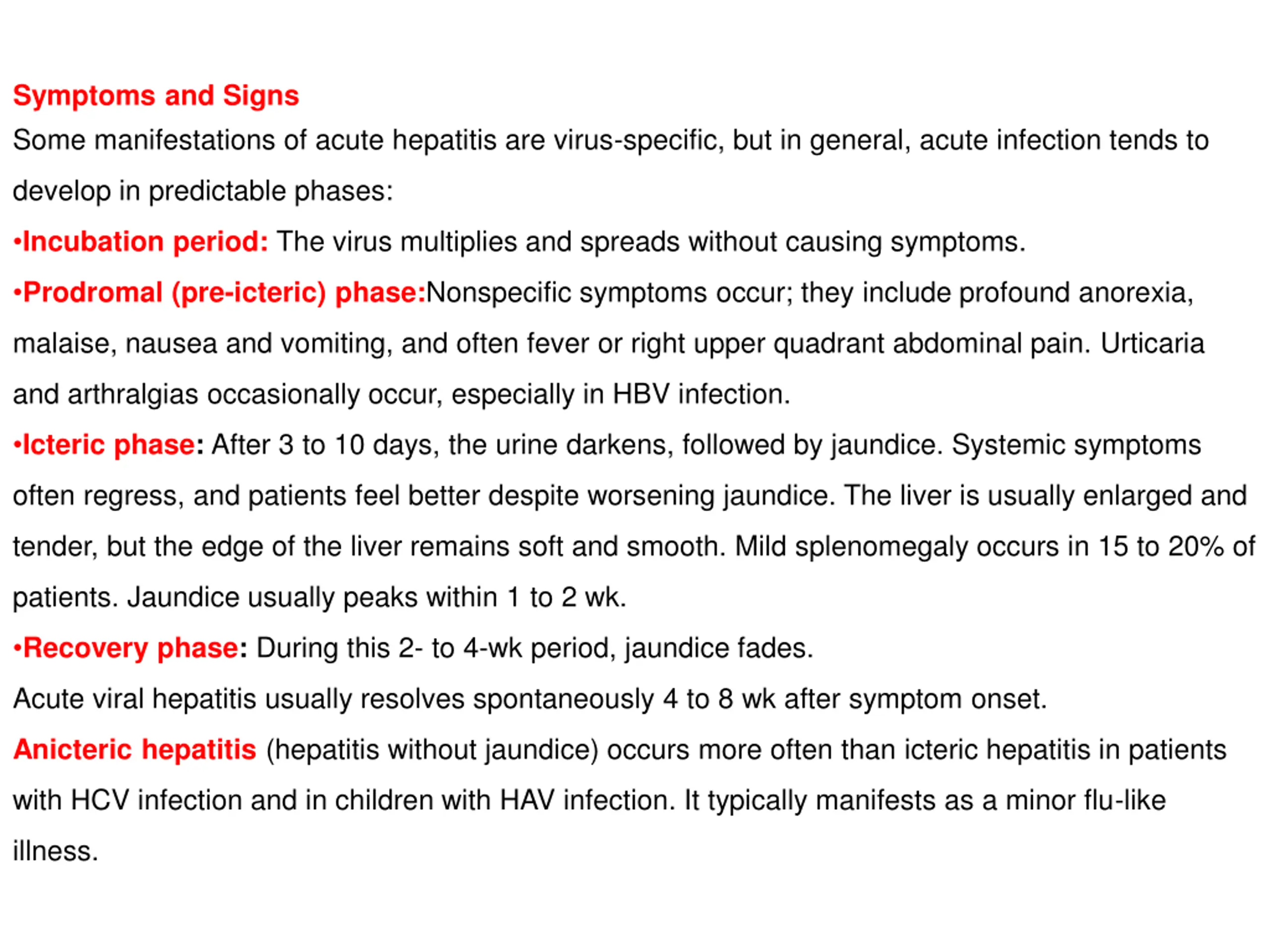 Symptoms and Signs Some manifestations of acute hepatitis are virus-specific, but in general, acute infection tends to develop in predictable phases: Incubation period: The virus multiplies and spreads without causing symptoms. Prodromal (pre-icteric) phase:Nonspecific symptoms occur; they include profound anorexia, malaise, nausea and vomiting, and often fever or right upper quadrant abdominal pain. Urticaria and arthralgias occasionally occur, especially in HBV infection. Icteric phase: After 3 to 10 days, the urine darkens, followed by jaundice. Systemic symptoms often regress, and patients feel better despite worsening jaundice. The liver is usually enlarged and tender, but the edge of the liver remains soft and smooth. Mild splenomegaly occurs in 15 to 20% of patients. Jaundice usually peaks within 1 to 2 wk. Recovery phase: During this 2- to 4-wk period, jaundice fades. Acute viral hepatitis usually resolves spontaneously 4 to 8 wk after symptom onset. Anicteric hepatitis (hepatitis without jaundice) occurs more often than icteric hepatitis in patients with HCV infection and in children with HAV infection. It typically manifests as a minor flu-like illness.