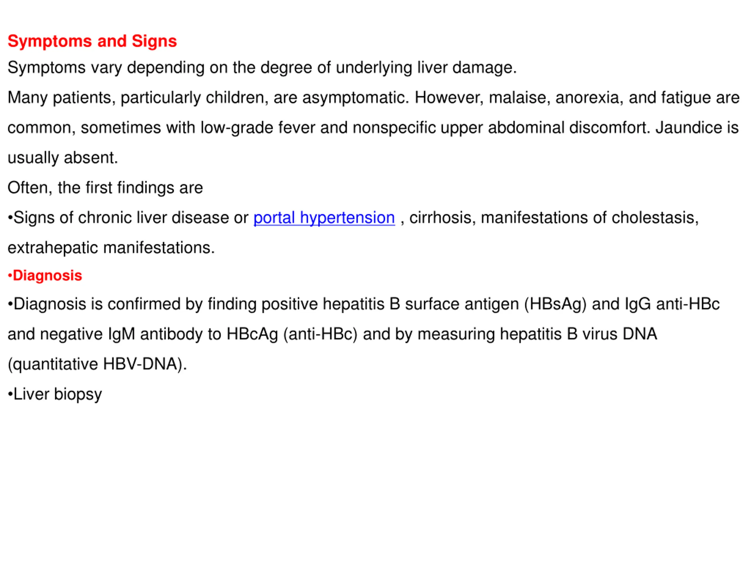 Symptoms and Signs Symptoms vary depending on the degree of underlying liver damage. Many patients, particularly children, are asymptomatic. However, malaise, anorexia, and fatigue are common, sometimes with low-grade fever and nonspecific upper abdominal discomfort. Jaundice is usually absent. Often, the first findings are Signs of chronic liver disease or portal hypertension , cirrhosis, manifestations of cholestasis, extrahepatic manifestations. Diagnosis Diagnosis is confirmed by finding positive hepatitis B surface antigen (HBsAg) and IgG anti-HBc and negative IgM antibody to HBcAg (anti-HBc) and by measuring hepatitis B virus DNA (quantitative HBV-DNA). Liver biopsy
