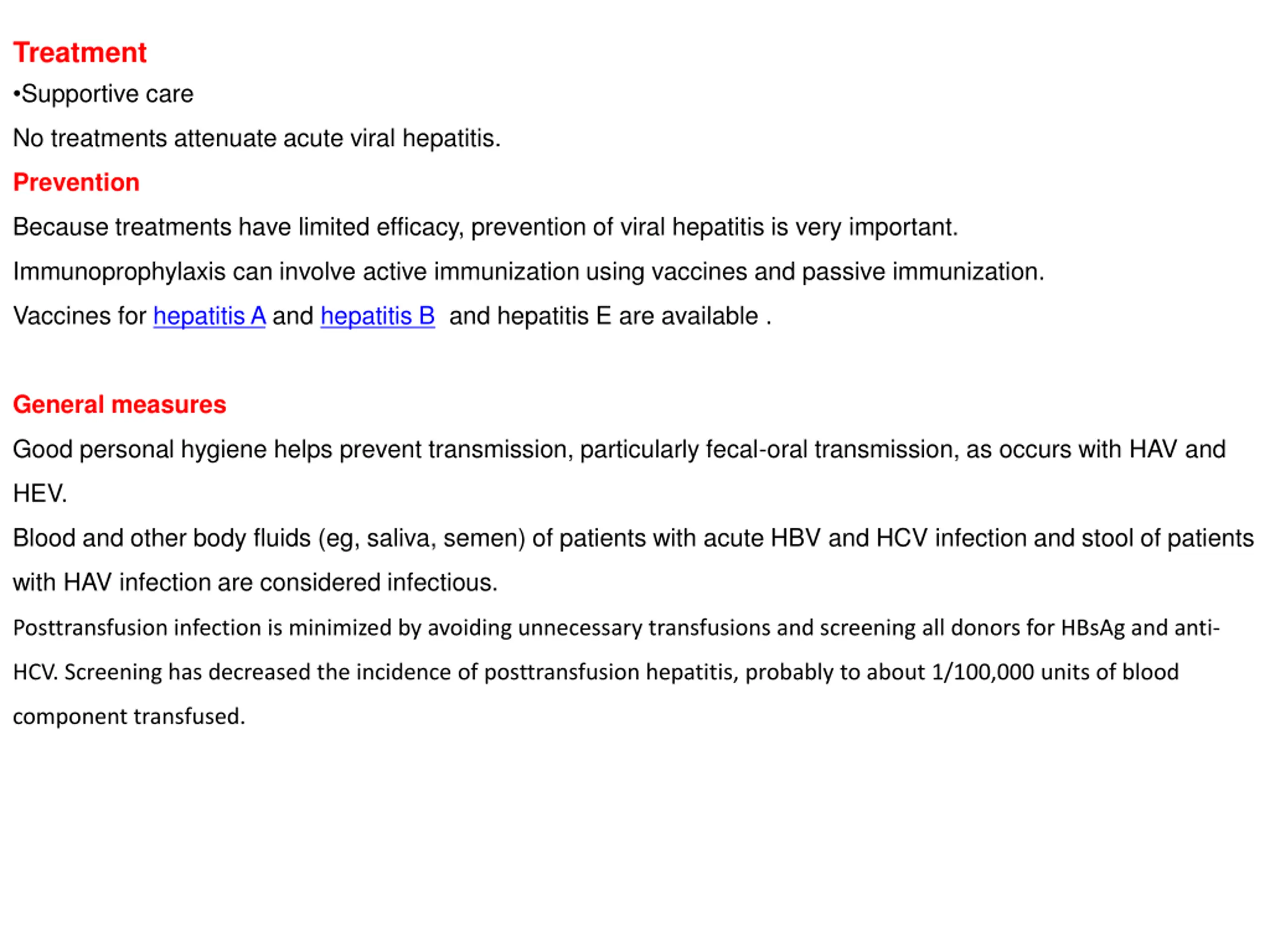 Treatment Supportive care No treatments attenuate acute viral hepatitis. Prevention Because treatments have limited efficacy, prevention of viral hepatitis is very important. Immunoprophylaxis can involve active immunization using vaccines and passive immunization. Vaccines for hepatitis A and hepatitis B and hepatitis E are available . General measures Good personal hygiene helps prevent transmission, particularly fecal-oral transmission, as occurs with HAV and HEV. Blood and other body fluids (eg, saliva, semen) of patients with acute HBV and HCV infection and stool of patients with HAV infection are considered infectious. Posttransfusion infection is minimized by avoiding unnecessary transfusions and screening all donors for HBsAg and anti- HCV. Screening has decreased the incidence of posttransfusion hepatitis, probably to about 1/100,000 units of blood component transfused.