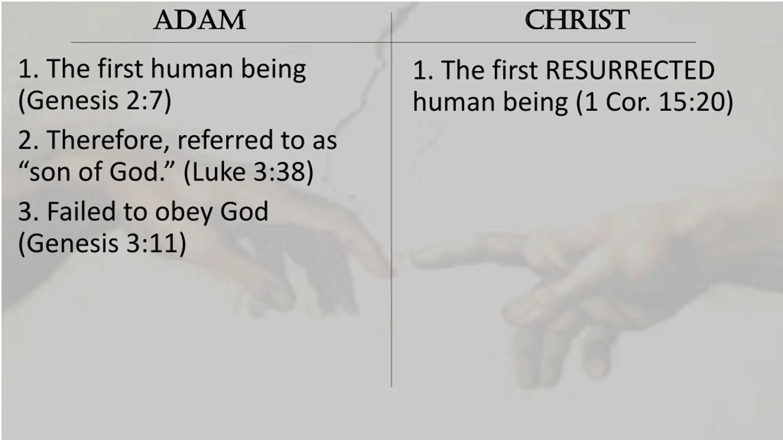 Adam Adam Christ Christ 1. The first human being (Genesis 2:7) 2. Therefore referred to as son of God. (Luke 3:38) 3. Failed to obey God (Genesis 3:11)