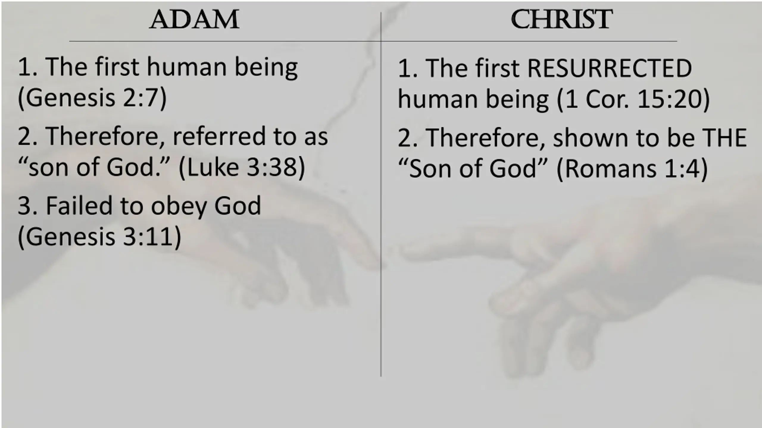 Adam Adam Christ Christ 1. The first human being (Genesis 2:7) 2. Therefore, referred to as son of God. (Luke 3:38) 3. Failed to obey God (Genesis 3:11) 1. The first RESURRECTED human being (1 Cor. 15:20) 2. Therefore, shown to be THE Son of God (Romans 1:4)