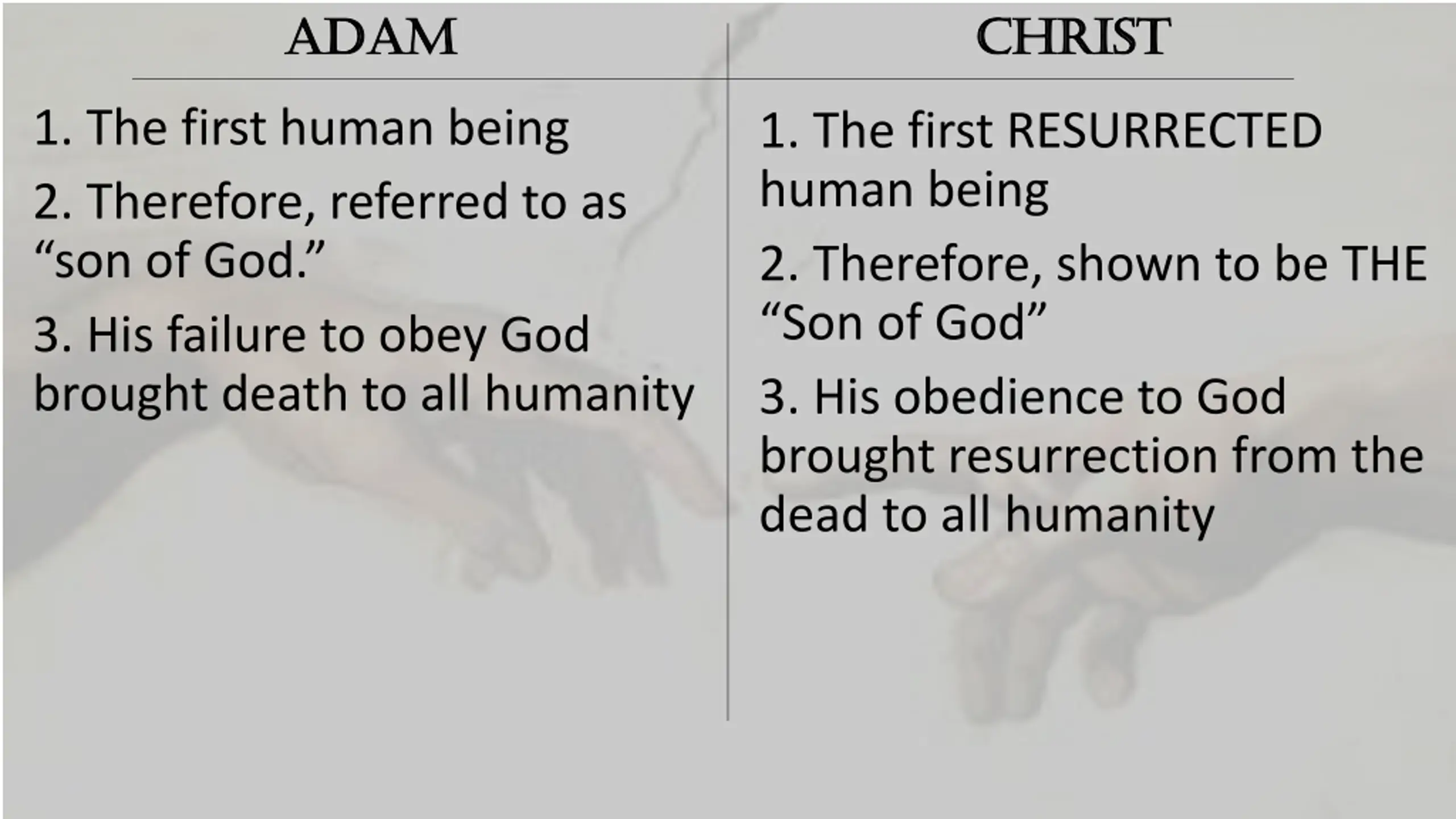 Adam Adam Christ Christ 1. The first human being 2. Therefore, referred to as son of God. 3. His failure to obey God brought death to all humanity 1. The first RESURRECTED human being 2. Therefore, shown to be THE Son of God 3. His obedience to God brought resurrection from the dead to all humanity