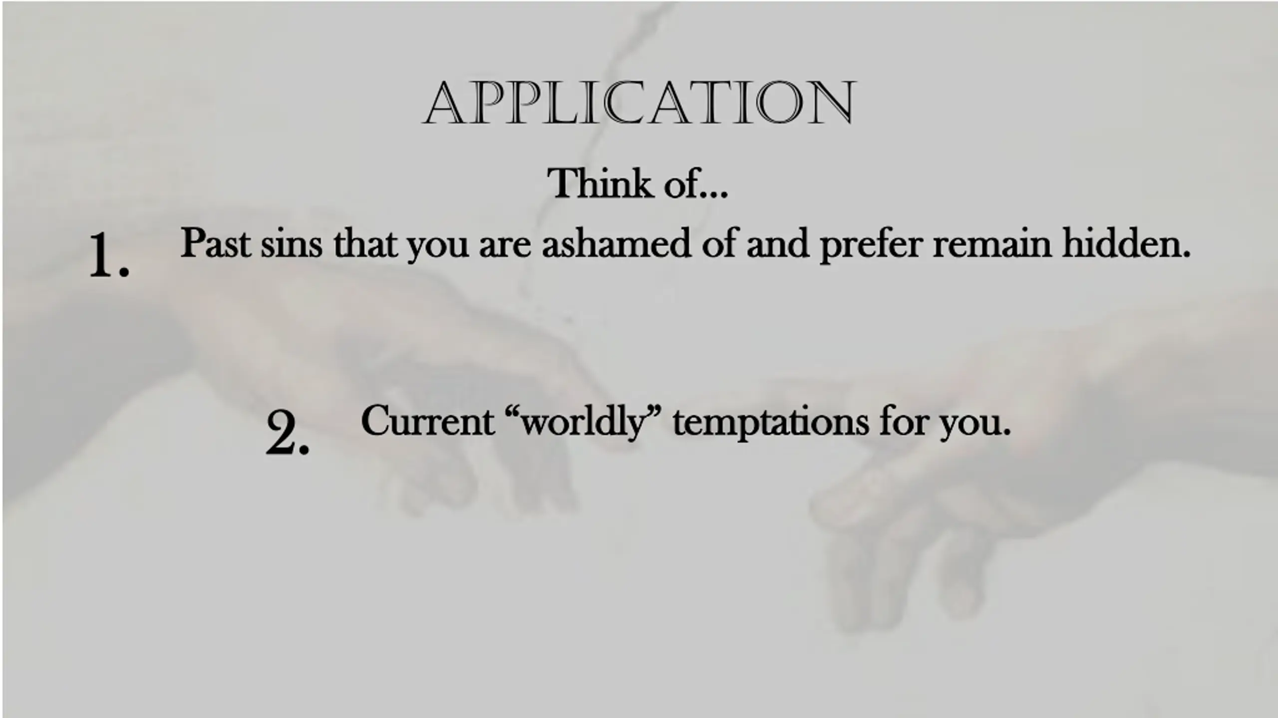 Application Think of Think of Past sins that you are ashamed of and prefer remain hidden. Past sins that you are ashamed of and prefer remain hidden. 1. 1. Current worldly temptations for you. Current worldly temptations for you. 2. 2.
