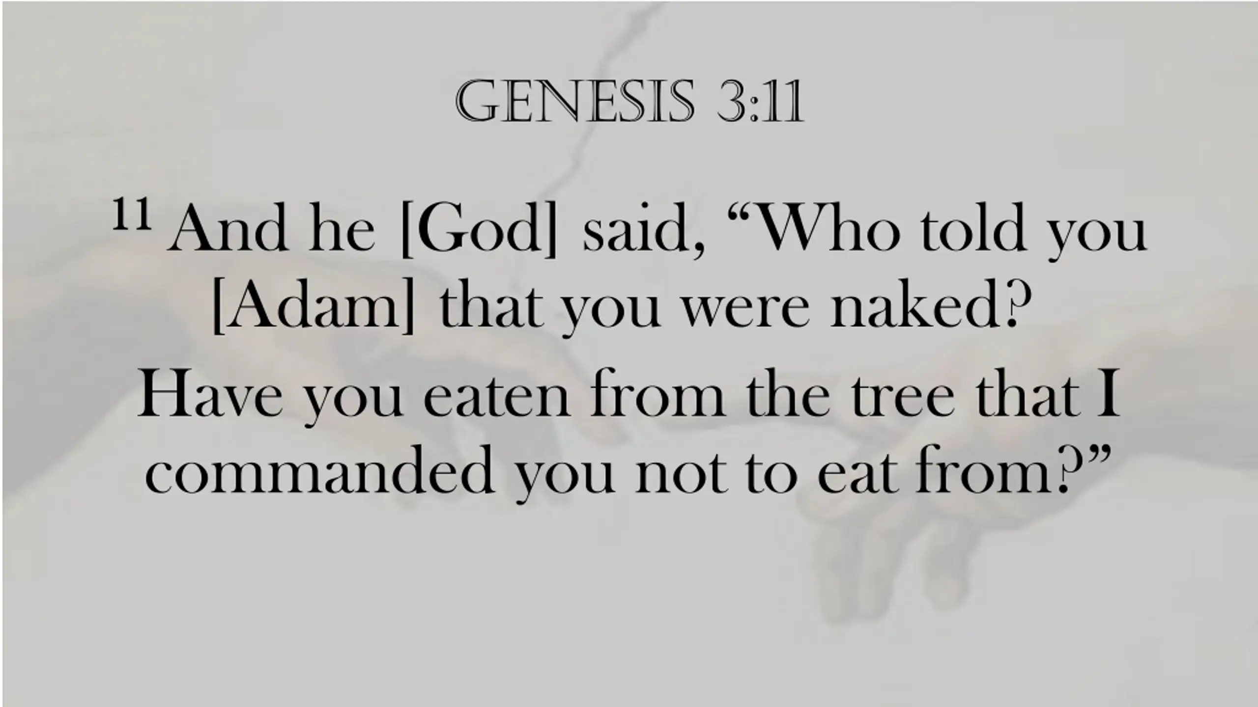 Genesis 3:11 11 11And he [God] said, Who told you [Adam] that you were naked? Have you eaten from the tree that I commanded you not to eat from?