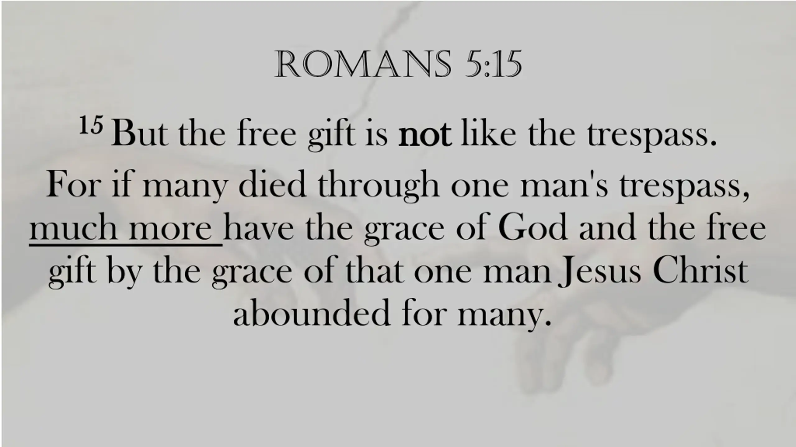 Romans 5:15 15 15But the free gift is not For if many died through one man's trespass, much more have the grace of God and the free gift by the grace of that one man Jesus Christ abounded for many. not like the trespass.