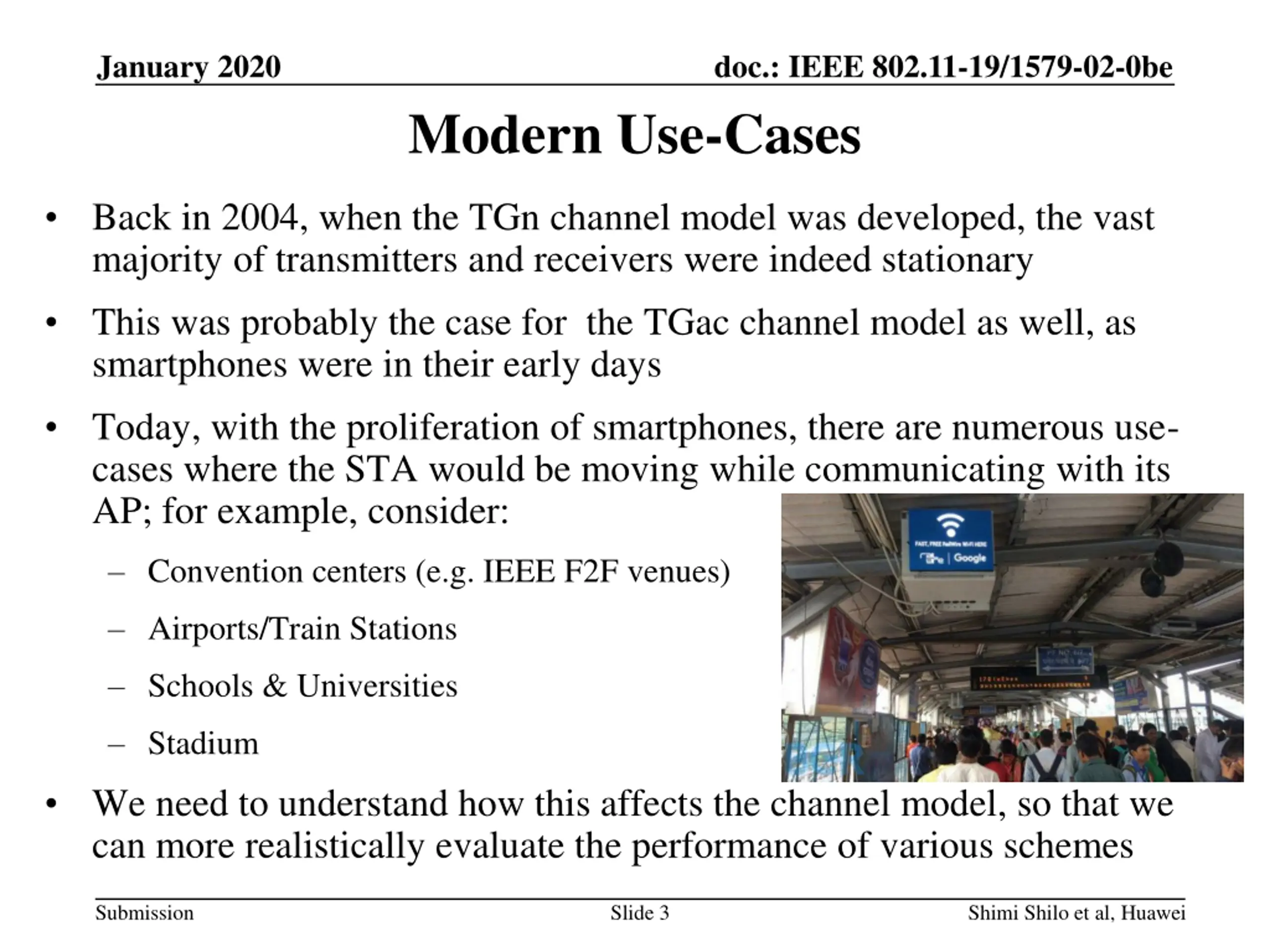 January 2020 doc.: IEEE 802.11-19/1579-02-0be Modern Use-Cases Back in 2004, when the TGn channel model was developed, the vast majority of transmitters and receivers were indeed stationary This was probably the case for the TGac channel model as well, as smartphones were in their early days Today, with the proliferation of smartphones, there are numerous use- cases where the STA would be moving while communicating with its AP; for example, consider: Convention centers (e.g. IEEE F2F venues) Airports/Train Stations Schools & Universities Stadium We need to understand how this affects the channel model, so that we can more realistically evaluate the performance of various schemes Submission Slide 3 Shimi Shilo et al, Huawei