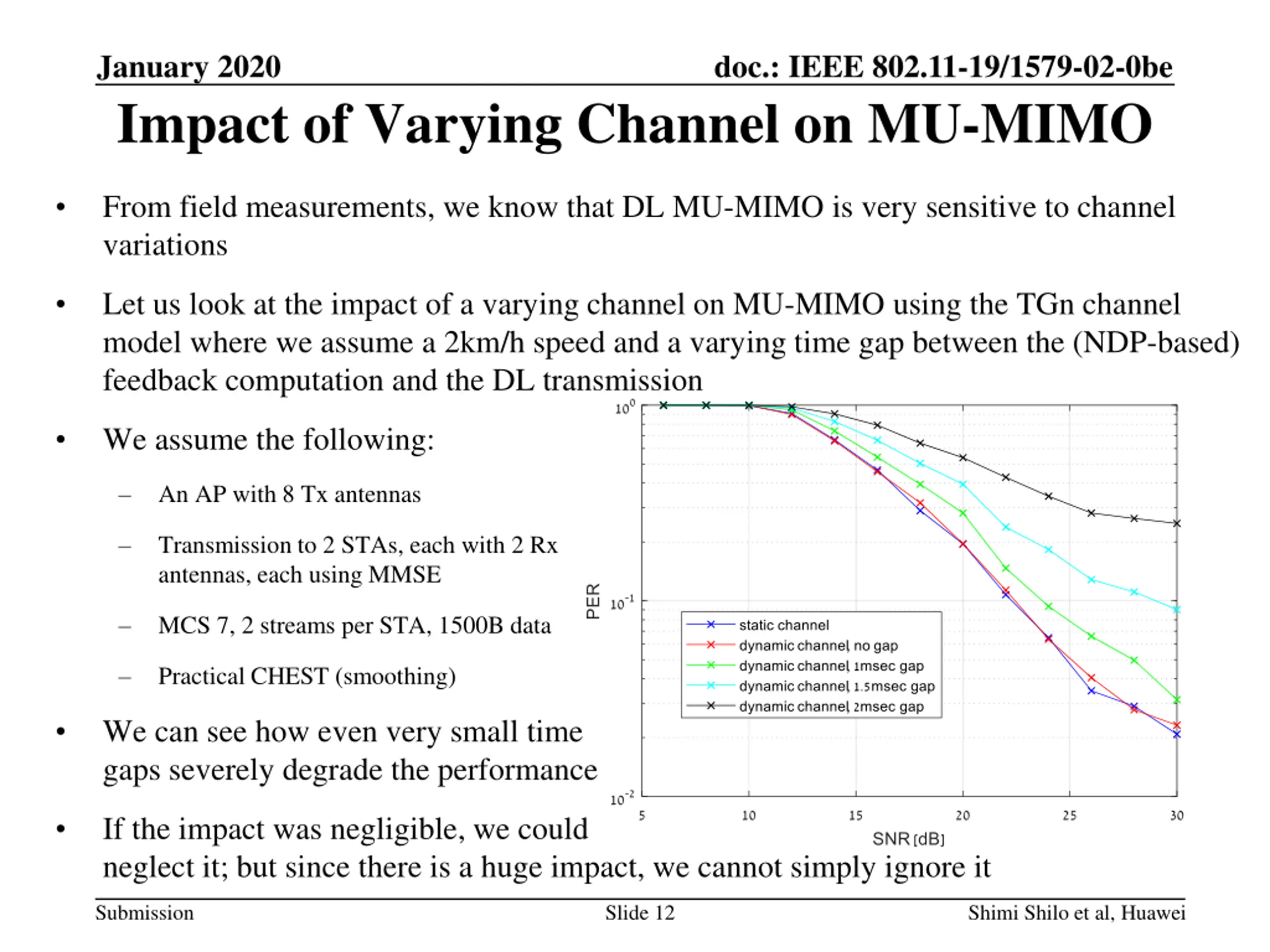 January 2020 doc.: IEEE 802.11-19/1579-02-0be Impact of Varying Channel on MU-MIMO From field measurements, we know that DL MU-MIMO is very sensitive to channel variations Let us look at the impact of a varying channel on MU-MIMO using the TGn channel model where we assume a 2km/h speed and a varying time gap between the (NDP-based) feedback computation and the DL transmission We assume the following: An AP with 8 Tx antennas Transmission to 2 STAs, each with 2 Rx antennas, each using MMSE MCS 7, 2 streams per STA, 1500B data Practical CHEST (smoothing) We can see how even very small time gaps severely degrade the performance If the impact was negligible, we could neglect it; but since there is a huge impact, we cannot simply ignore it Submission Slide 12 Shimi Shilo et al, Huawei