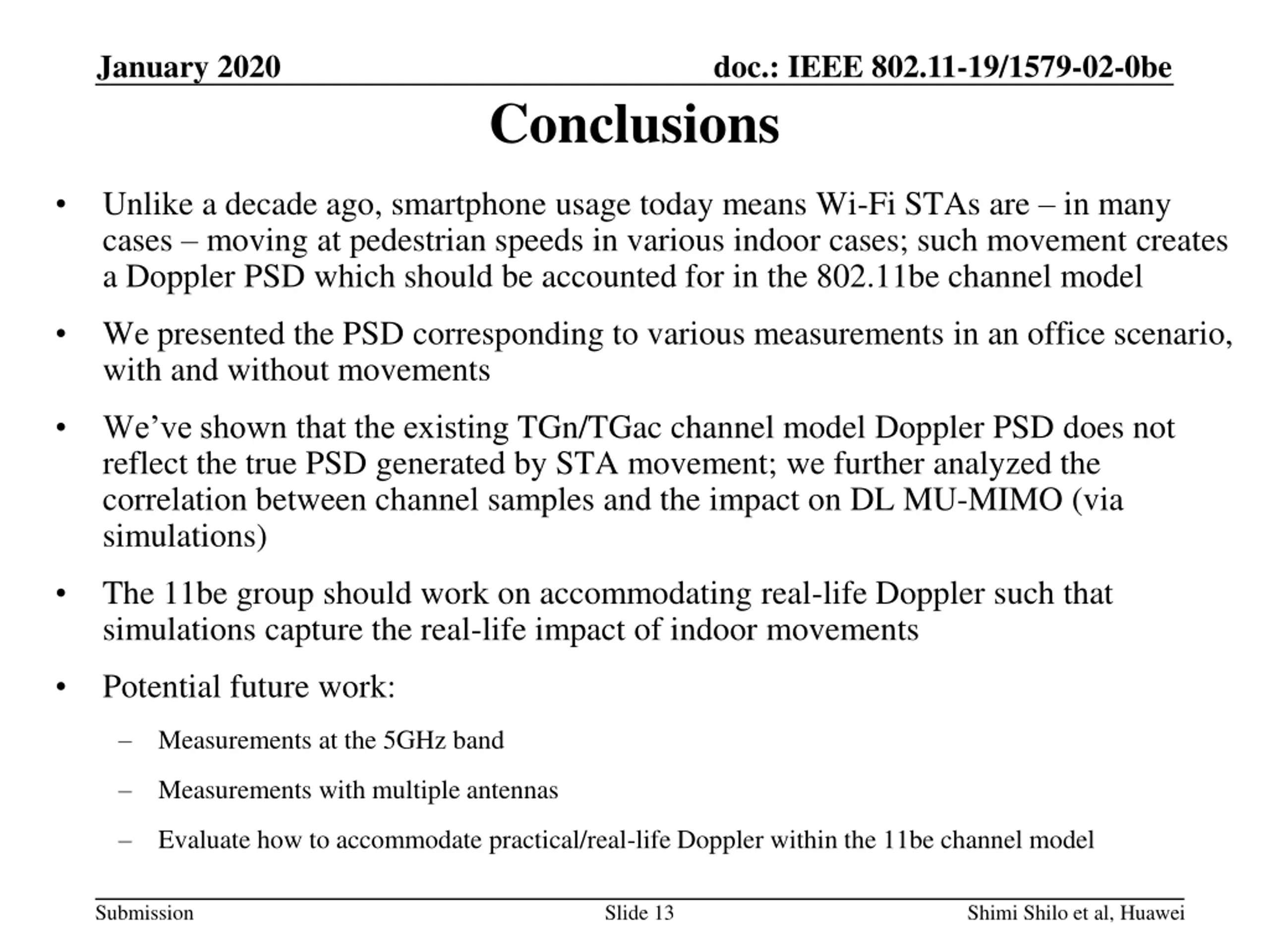 January 2020 doc.: IEEE 802.11-19/1579-02-0be Conclusions Unlike a decade ago, smartphone usage today means Wi-Fi STAs are in many cases moving at pedestrian speeds in various indoor cases; such movement creates a Doppler PSD which should be accounted for in the 802.11be channel model We presented the PSD corresponding to various measurements in an office scenario, with and without movements We ve shown that the existing TGn/TGac channel model Doppler PSD does not reflect the true PSD generated by STA movement; we further analyzed the correlation between channel samples and the impact on DL MU-MIMO (via simulations) The 11be group should work on accommodating real-life Doppler such that simulations capture the real-life impact of indoor movements Potential future work: Measurements at the 5GHz band Measurements with multiple antennas Evaluate how to accommodate practical/real-life Doppler within the 11be channel model Submission Slide 13 Shimi Shilo et al, Huawei